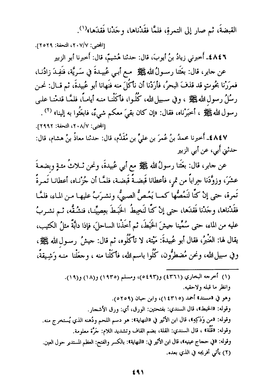 4847 - أَخْبَرَنَا مُحَمَّدُ بْنُ عُمَرَ بْنِ عَلِيِّ بْنِ مُقَدَّمٍ، قَالَ: حَدَّثَنَا مُعَاذُ بْنُ هِشَامٍ، قَالَ: حَدَّثَنِي أَبِي، عَنْ أَبِي الزُّبَيْرِ، عَنْ جَابِرٍ، قَالَ: بَعَثَنَا رَسُولُ اللهِ صَلَّى اللهُ عَلَيْهِ وَسَلَّمَ مَعَ أَبِي عُبَيْدَةَ، وَنَحْنُ ثَلَاثُمِائَةٍ وَبِضْعَةَ عَشَرَ وَزَوَّدَنَا جِرَابًا مِنْ تَمْرٍ، فَأَعْطَانَا قَبْضَةً قَبْضَةً، فَلَمَّا أَنْ جُزْنَاهُ أَعْطَانَا تَمْرَةً تَمْرَةً، حَتَّى إِنْ كُنَّا لَنَمُصُّهَا كَمَا يَمُصُّ الصَّبِيُّ، وَنَشْرَبُ عَلَيْهَا مِنَ الْمَاءِ، فَلَمَّا فَقَدْنَاهَا وَجَدْنَا فَقْدَهَا حَتَّى إِنْ كُنَّا لَنَخْبِطُ الْخَبَطَ بِعِصِيِّنَا فَنَشُقُّهُ، ثُمَّ نَشْرَبُ عَلَيْهِ مِنَ الْمَاءِ حَتَّى سُمِّينَا جَيْشَ الْخَبَطِ، ثُمَّ أَخَذْنَا السَّاحِلَ، فَإِذَا دَابَّةٌ مِثْلُ الْكَثِيبِ يُقَالُ لَهُ: الْعَنْبَرُ، فَقَالَ أَبُو عُبَيْدَةَ: مَيْتَةٌ لَا تَأْكُلُوهُ، ثُمَّ قَالَ: جَيْشُ رَسُولِ اللهِ صَلَّى اللهُ عَلَيْهِ وَسَلَّمَ، وَفِي سَبِيلِ اللهِ، وَنَحْنُ مُضْطَرُّونَ كُلُوا بِاسْمِ اللهِ، فَأَكَلْنَا مِنْهُ وَجَعَلْنَا مِنْهُ وَشِيقَةً قَالَ: وَلَقَدْ جَلَسَ فِي مَوْضِعِ عَيْنِهِ ثَلَاثَةَ عَشَرَ رَجُلًا، قَالَ: وَأَخَذَ أَبُو عُبَيْدَةَ ضِلْعًا مِنْ أَضْلَاعِهِ، فَرَحَلَ بِهِ أَجْسَمُ بَعِيرٍ مِنْ أَبَاعِرِ الْقَوْمِ فَأَجَازَ تَحْتَهُ، فَلَمَّا قَدِمْنَا عَلَى رَسُولِ اللهِ صَلَّى اللهُ عَلَيْهِ وَسَلَّمَ قَالَ: «§مَا حَبَسَكُمْ؟» قُلْنَا: كُنَّا تَتَبَّعْنَا عِيرَاتِ قُرَيْشٍ وَذَكَرْنَا لَهُ أَمْرَ الدَّابَّةِ، فَقَالَ: «ذَاكَ رِزْقٌ رَزَقَكُمُوهُ اللهُ أَمَعَكُمْ مِنْهُ شَيْءٌ؟» قَالَ: قُلْنَا: نَعَمْ