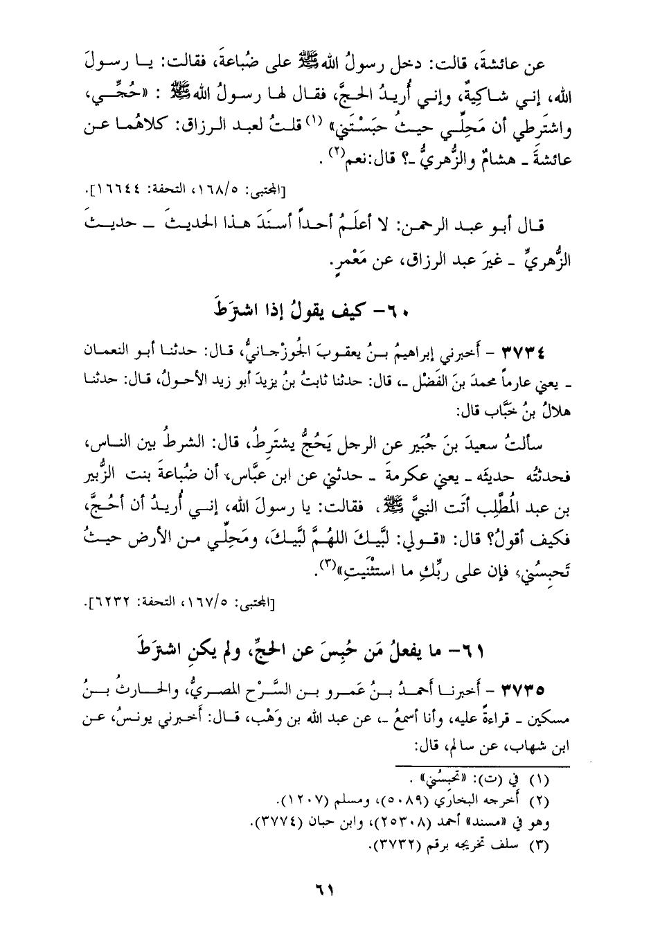 3733 - أَخْبَرَنَا إِسْحَاقُ بْنُ إِبْرَاهِيمَ بْنِ رَاهُوَيْهِ، قَالَ: أَخْبَرَنَا عَبْدُ الرَّزَّاقِ، قَالَ: حَدَّثَنَا مَعْمَرٌ، عَنِ الزُّهْرِيِّ، عَنْ عُرْوَةَ، عَنْ عَائِشَةَ، وَعَنْ هِشَامِ بْنِ عُرْوَةَ، عَنْ أَبِيهِ، عَنْ عَائِشَةَ، قَالَتْ: دَخَلَ رَسُولُ اللهِ صَلَّى اللهُ عَلَيْهِ وَسَلَّمَ عَلَى ضُبَاعَةَ، فَقَالَتْ يَا رَسُولَ اللهِ، إِنِّي شَاكِيَةٌ، وَإِنِّي أُرِيدُ الْحَجَّ، فَقَالَ لَهَا رَسُولُ اللهِ صَلَّى اللهُ عَلَيْهِ وَسَلَّمَ: «§حُجِّي وَاشْتَرِطِي أَنَّ مَحِلِّي حَيْثُ حَبَسْتَنِي» قُلْتُ لِعَبْدِ الرَّزَّاقِ، كِلَاهُمَا عَنْ عَائِشَةَ وَهِشَامٍ وَالزُّهْرِيٍّ، قَالَ: نَعَمْ، قَالَ أَبُو عَبْدِ الرَّحْمَنِ: لَا أَعْلَمُ أَحَدًا أَسْنَدَ هَذَا الْحَدِيثَ حَدِيثَ الزُّهْرِيِّ غَيْرَ عَبْدِ الرَّزَّاقِ عَنْ مَعْمَرٍ