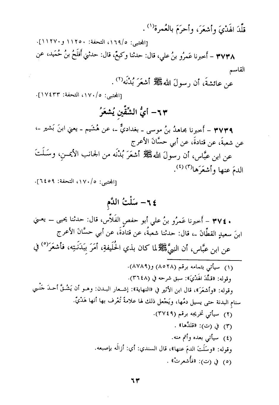 3739 - أَخْبَرَنَا مُجَاهِدُ بْنُ مُوسَى، بَغْدَادِيٌّ عَنْ هُشَيْمٍ يَعْنِي ابْنَ بَشِيرٍ، عَنْ شُعْبَةَ، عَنْ قَتَادَةَ، عَنْ أَبِي حَسَّانَ الْأَعْرَجِ، عَنِ ابْنِ عَبَّاسٍ، أَنَّ رَسُولَ اللهِ صَلَّى اللهُ عَلَيْهِ وَسَلَّمَ «§أَشْعَرَ بُدْنَهُ مِنَ الْجَانِبِ الْأَيْمَنِ، وَسَلَتَ الدَّمَ عَنْهَا وَأَشْعَرَهَا»