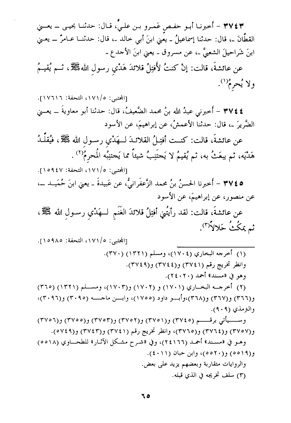 3745 - أَخْبَرَنَا الْحَسَنُ بْنُ مُحَمَّدٍ الزَّعْفَرَانِيُّ، عَنْ عَبِيدَةُ يَعْنِي ابْنَ حُمَيْدٍ، عَنْ مَنْصُورٍ، عَنْ إِبْرَاهِيمَ، عَنِ الْأَسْوَدِ، عَنْ عَائِشَةَ قَالَتْ: «§لَقَدْ رَأَيْتُنِي أَفْتِلُ قَلَائِدَ الْغَنَمِ لِهَدْيِ رَسُولِ اللهِ صَلَّى اللهُ عَلَيْهِ وَسَلَّمَ ثُمَّ يَمْكُثُ حَلَالًا»