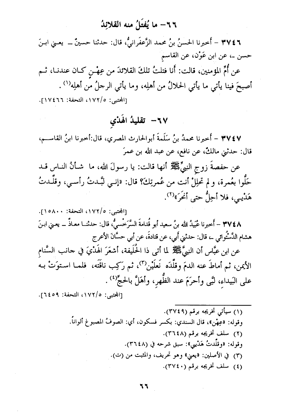 3747 - أَخْبَرَنَا مُحَمَّدُ بْنُ سَلَمَةَ أَبُو الْحَارِثِ الْمِصْرِيُّ، قَالَ: أَخْبَرَنَا ابْنُ الْقَاسِمِ، قَالَ: حَدَّثَنِي مَالِكٌ، عَنْ نَافِعٍ، عَنْ عَبْدِ اللهِ بْنِ عُمَرَ، عَنْ حَفْصَةَ، زَوْجِ النَّبِيِّ صَلَّى اللهُ عَلَيْهِ وَسَلَّمَ أَنَّهَا، قَالَتْ: يَا رَسُولَ اللهِ، مَا شَأْنُ النَّاسِ قَدْ حَلُّوا بِعُمْرَةٍ وَلَمْ تَحْلِلْ أَنْتَ مِنْ عُمْرَتِكَ؟ قَالَ: «§إِنِّي لَبَّدْتُ رَأْسِي، وَقَلَّدْتُ هَدْيِي فَلَا أَحِلُّ حَتَّى أَنْحَرَ»