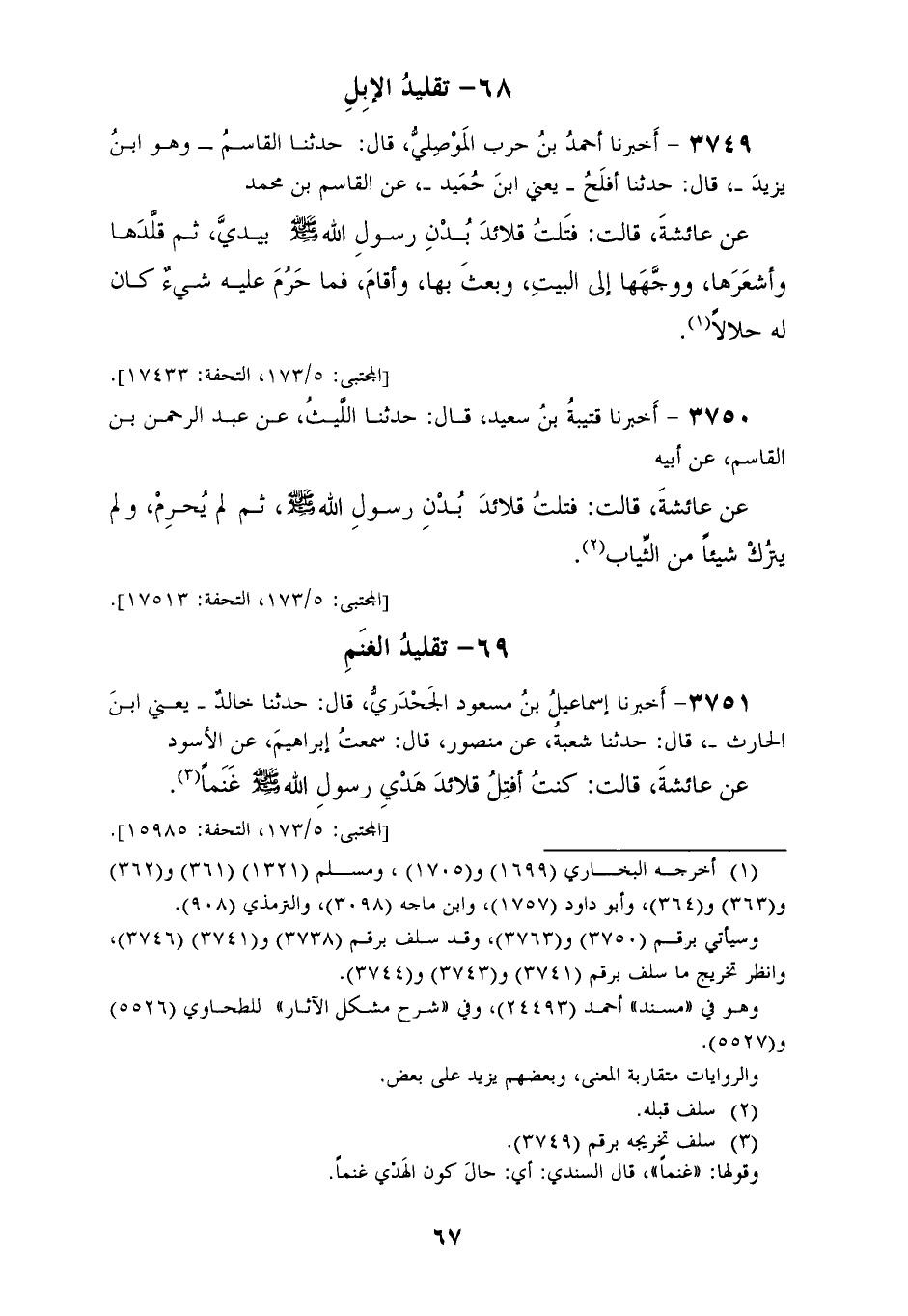 3751 - أَخْبَرَنَا إِسْمَاعِيلُ بْنُ مَسْعُودٍ الْجَحْدَرِيُّ، قَالَ: حَدَّثَنَا خَالِدٌ يَعْنِي ابْنَ الْحَارِثِ، قَالَ: حَدَّثَنَا شُعْبَةُ، عَنْ مَنْصُورٍ، قَالَ: سَمِعْتُ إِبْرَاهِيمَ، عَنِ الْأَسْوَدِ، عَنْ عَائِشَةَ، قَالَتْ: «§كُنْتُ أَفْتِلُ قَلَائِدَ هَدْيِ رَسُولِ اللهِ صَلَّى اللهُ عَلَيْهِ وَسَلَّمَ غَنَمًا»