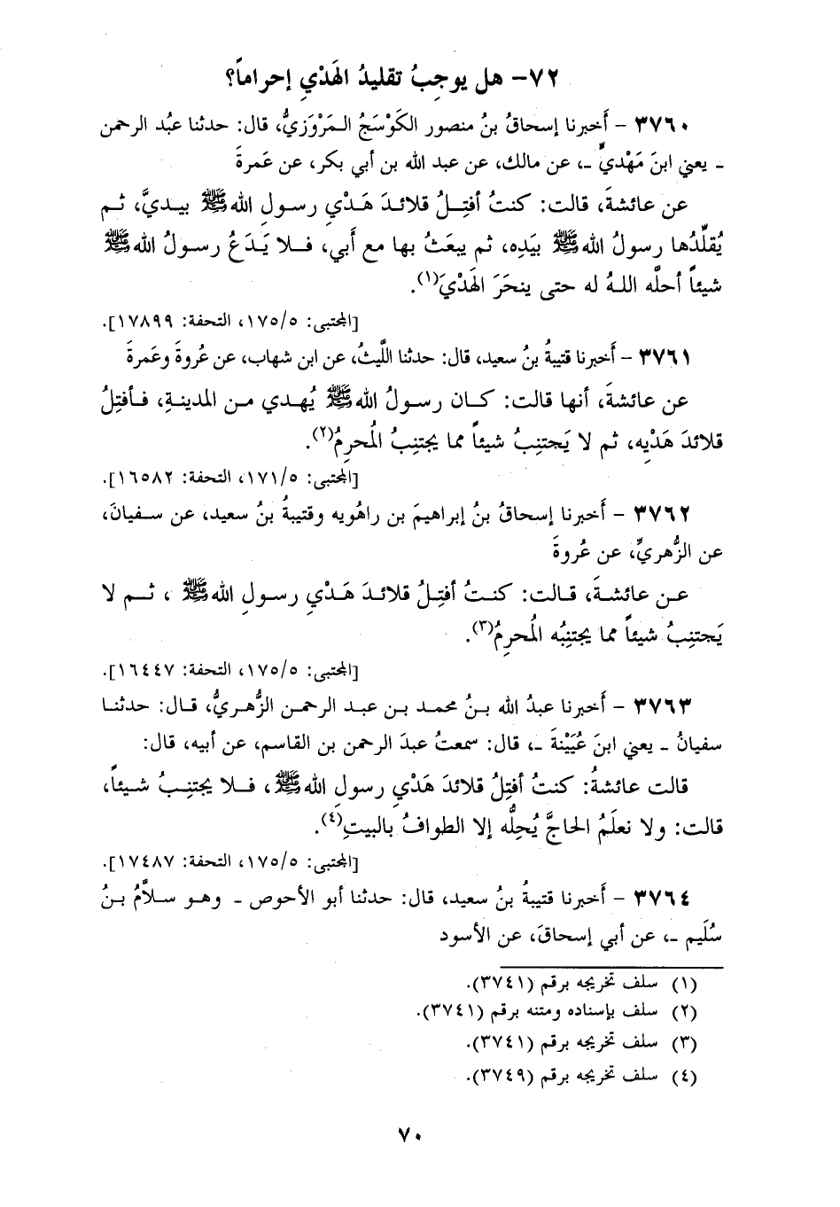 3760 - أَخْبَرَنَا إِسْحَاقُ بْنُ مَنْصُورٍ الْكَوْسَجُ المَرْوَزِيٌّ، قَالَ: حَدَّثَنَا عَبْدُ الرَّحْمَنِ يَعْنِي ابْنَ مَهْدِيٍّ، عَنْ مَالِكٍ، عَنْ عَبْدِ اللهِ بْنِ أَبِي بَكْرٍ، عَنْ عَمْرَةَ، عَنْ عَائِشَةَ، قَالَتْ: كُنْتُ أَفْتِلُ قَلَائِدَ هَدْيِ رَسُولِ اللهِ صَلَّى اللهُ عَلَيْهِ وَسَلَّمَ بِيَدِي، ثُمَّ يُقَلِّدُهَا رَسُولُ اللهِ صَلَّى اللهُ عَلَيْهِ وَسَلَّمَ بِيَدِهِ، ثُمَّ يَبْعَثُ بِهَا مَعَ أَبِي «§فَلَا يَدَعُ رَسُولُ اللهِ صَلَّى اللهُ عَلَيْهِ وَسَلَّمَ شَيْئًا أَحَلَّهُ اللهُ لَهُ حَتَّى يَنْحَرَ الْهَدْيَ»