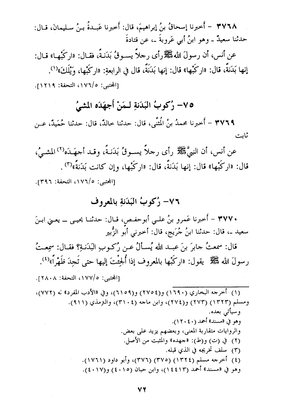 3769 - أَخْبَرَنَا مُحَمَّدُ بْنُ الْمُثَنَّى، قَالَ: حَدَّثَنَا خَالِدٌ، قَالَ: حَدَّثَنَا حُمَيْدٌ، عَنْ ثَابِتٍ، عَنْ أَنَسٍ، أَنَّ النَّبِيَّ صَلَّى اللهُ عَلَيْهِ وَسَلَّمَ رَأَى رَجُلًا يَسُوقُ بَدَنَةً وَقَدْ أَجْهَدَهُ الْمَشْيُ، قَالَ: «ارْكَبْهَا» قَالَ: إِنَّهَا بَدَنَةٌ قَالَ: «§ارْكَبْهَا، وَإِنْ كَانَتْ بَدَنَةً»