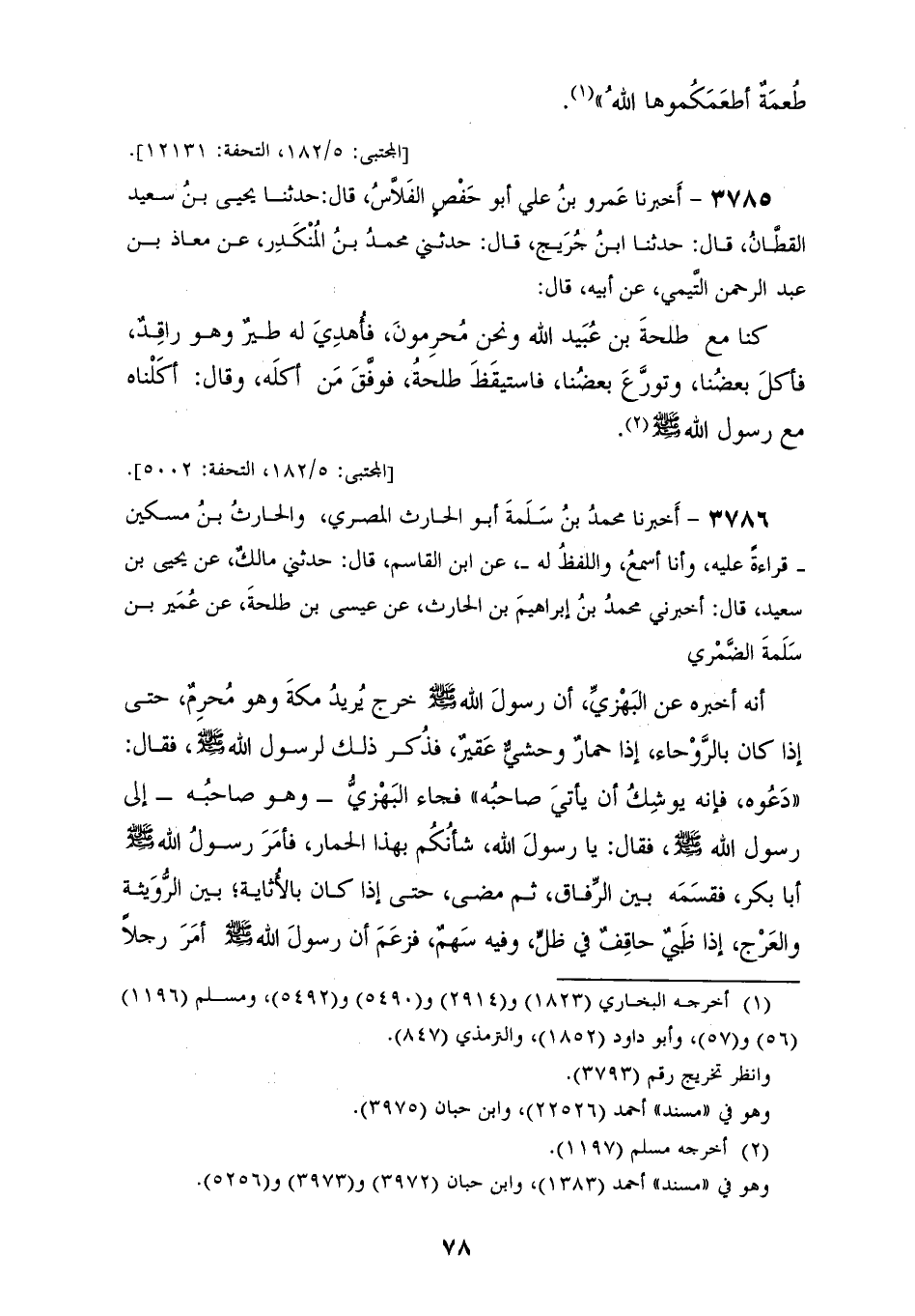 3785 - أَخْبَرَنَا عَمْرُو بْنُ عَلِيٍّ أَبُو حَفْصٍ الْفَلَّاسُ، قَالَ: حَدَّثَنَا يَحْيَى بْنُ سَعِيدٍ الْقَطَّانُ، قَالَ: حَدَّثَنَا ابْنُ جُرَيْجٍ، قَالَ: حَدَّثَنِي مُحَمَّدُ بْنُ الْمُنْكَدِرِ، عَنْ مُعَاذِ بْنِ عَبْدِ الرَّحْمَنِ التَّيْمِيِّ، عَنْ أَبِيهِ، قَالَ: كُنَّا مَعَ طَلْحَةَ بْنِ عُبَيْدِ اللهِ وَنَحْنُ مُحْرِمُونَ، فَأُهْدِيَ لَهُ طَيْرٌ وَهُوَ رَاقِدٌ، فَأَكَلَ بَعْضُنَا وَتَوَرَّعَ بَعْضُنَا، فَاسْتَيْقَظَ طَلْحَةُ فَوَفَّقَ مَنْ أَكَلَهُ، وَقَالَ: «§أَكَلْنَاهُ مَعَ رَسُولِ اللهِ صَلَّى اللهُ عَلَيْهِ وَسَلَّمَ»