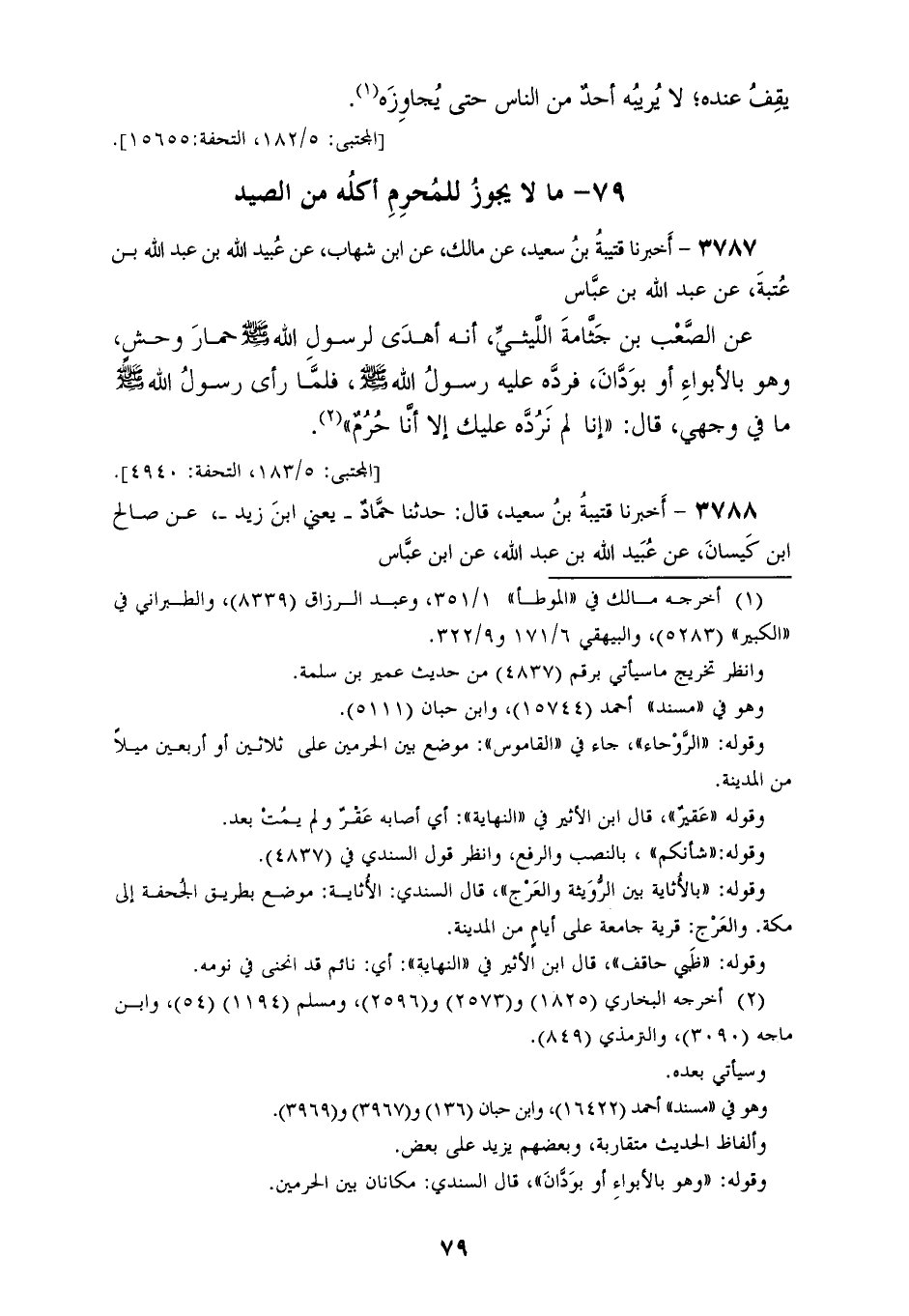 3787 - أَخْبَرَنَا قُتَيْبَةُ بْنُ سَعِيدٍ، عَنْ مَالِكٍ، عَنِ ابْنِ شِهَابٍ، عَنْ عُبَيْدِ اللهِ بْنِ عَبْدِ اللهِ بْنِ عُتْبَةَ، عَنْ عَبْدِ اللهِ بْنِ عَبَّاسٍ، عَنِ الصَّعْبِ بْنِ جَثَّامَةَ اللَّيْثِيِّ، أَنَّهُ أَهْدَى لِرَسُولِ اللهِ صَلَّى اللهُ عَلَيْهِ وَسَلَّمَ حِمَارَ وَحْشٍ وَهُوَ بِالْأَبْوَاءِ أَوْ بِوَدَّانَ، فَرَدَّهُ عَلَيْهِ رَسُولُ اللهِ صَلَّى اللهُ عَلَيْهِ وَسَلَّمَ، فَلَمَّا رَأَى رَسُولُ اللهِ صَلَّى اللهُ عَلَيْهِ وَسَلَّمَ مَا فِي وَجْهِي، قَالَ: «§إِنَّا لَمْ نَرُدَّهُ عَلَيْكَ إِلَّا أَنَّا حُرُمٌ»