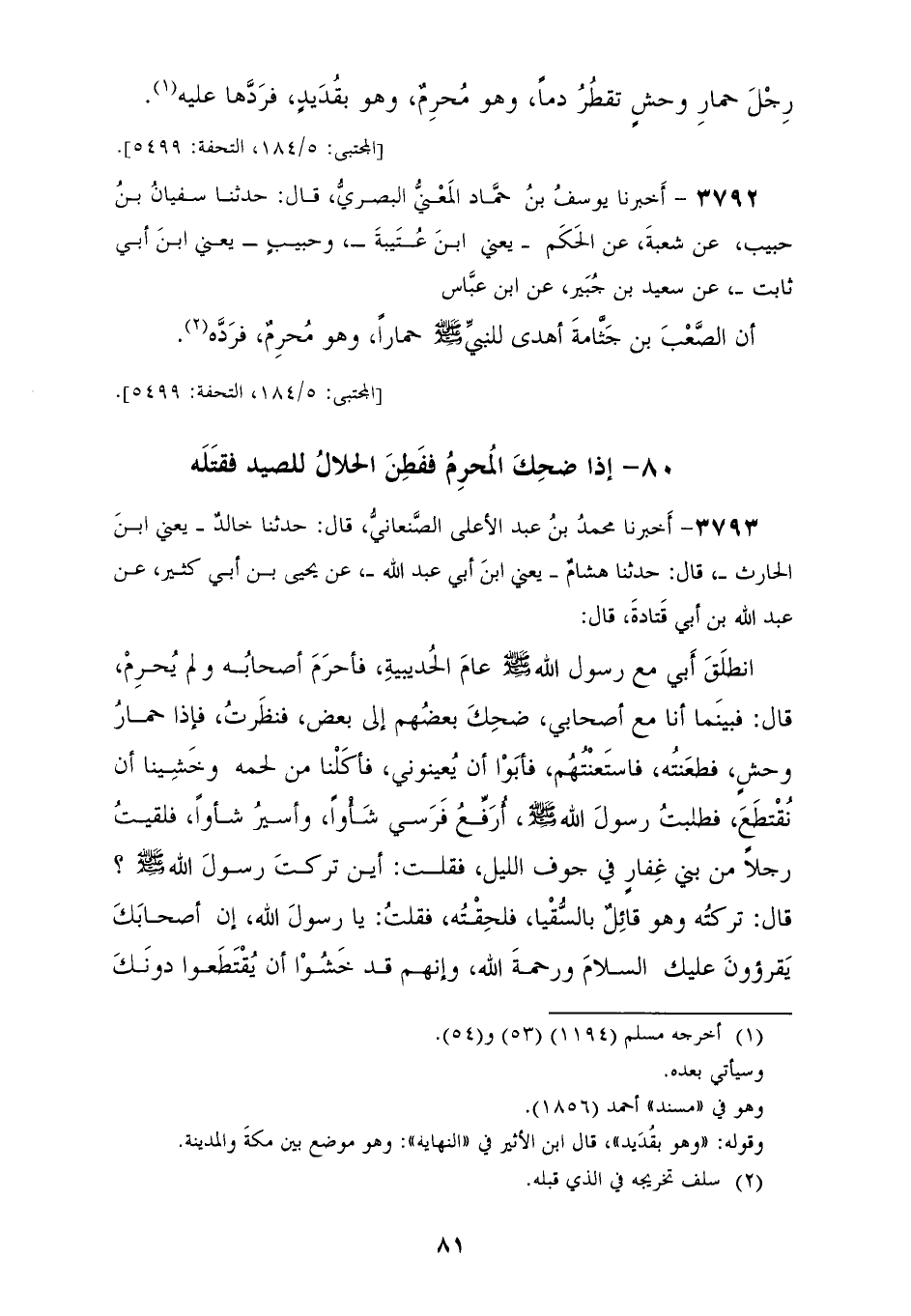3793 - أَخْبَرَنَا مُحَمَّدُ بْنُ عَبْدِ الْأَعْلَى الصَّنْعَانِيُّ، قَالَ: حَدَّثَنَا خَالِدٌ يَعْنِي ابْنَ الْحَارِثِ، قَالَ: حَدَّثَنَا هِشَامٌ يَعْنِي ابْنَ أَبِي عَبْدِ اللهِ، عَنْ يَحْيَى بْنِ أَبِي كَثِيرٍ، عَنْ عَبْدِ اللهِ بْنِ أَبِي قَتَادَةَ، قَالَ: انْطَلَقَ أَبِي مَعَ رَسُولِ اللهِ صَلَّى اللهُ عَلَيْهِ وَسَلَّمَ عَامَ الْحُدَيْبِيَةِ فَأَحْرَمَ أَصْحَابُهُ وَلَمْ يُحْرِمْ، قَالَ: فَبَيْنَمَا أَنَا مَعَ أَصْحَابِي ضَحِكَ بَعْضُهُمْ إِلَى بَعْضٍ، فَنَظَرْتُ فَإِذَا حِمَارُ وَحْشٍ فَطَعَنْتُهُ فَاسْتَعَنْتُهُمْ فَأَبَوْا أَنْ يُعِينُونِي، فَأَكَلْنَا مِنْ لَحْمِهِ وَخَشِينَا أَنْ نُقْتَطَعَ، فَطَلَبْتُ رَسُولَ اللهِ صَلَّى اللهُ عَلَيْهِ وَسَلَّمَ أَرْفَعُ فَرَسِي شَأْوًا وَأَسِيرُ شَأْوًا فَلَقِيتُ رَجُلًا مِنْ بَنِي غِفَارٍ فِي جَوْفِ اللَّيْلِ فَقُلْتُ: أَيْنَ تَرَكْتَ رَسُولَ اللهِ صَلَّى اللهُ عَلَيْهِ وَسَلَّمَ؟ قَالَ: «§تَرَكْتُهُ وَهُوَ قَائِلٌ بِالسُّقْيَا، فَلَحِقْتُهُ» فَقُلْتُ: يَا رَسُولَ اللهِ، إِنَّ أَصْحَابَكَ يَقْرَءُونَ عَلَيْكَ السَّلَامَ وَرَحْمَةَ اللهِ وَإِنَّهُمْ قَدْ خَشُوا أَنْ يُقْتَطَعُوا دُونَكَ فَانْتَظِرْهُمْ فَانْتَظَرَهُمْ، فَقُلْتُ: يَا رَسُولَ اللهِ إِنِّي أَصَبْتُ حِمَارَ وَحْشٍ وَعِنْدِي مِنْهُ فَقَالَ لِلْقَوْمِ: «كُلُوا» وَهُمْ مُحْرِمُونَ