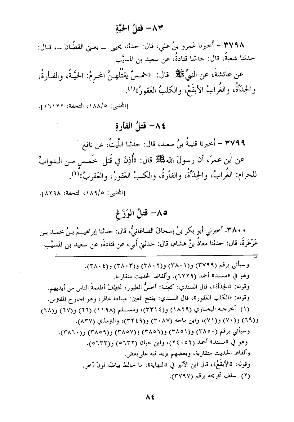 3798 - أَخْبَرَنَا عَمْرُو بْنُ عَلِيٍّ، قَالَ: حَدَّثَنَا يَحْيَى يَعْنِي الْقَطَّانَ، قَالَ: حَدَّثَنَا شُعْبَةُ، قَالَ: حَدَّثَنَا قَتَادَةُ، عَنْ سَعِيدِ بْنِ الْمُسَيِّبِ، عَنْ عَائِشَةَ، عَنِ النَّبِيِّ صَلَّى اللهُ عَلَيْهِ وَسَلَّمَ قَالَ: " §خَمْسٌ يَقْتُلُهُنَّ الْمُحْرِمُ: الْحَيَّةُ، وَالْفَأْرَةُ، وَالْحِدَأَةُ، وَالْغُرَابُ الْأَبْقَعُ، وَالْكَلْبُ الْعَقُورُ "
