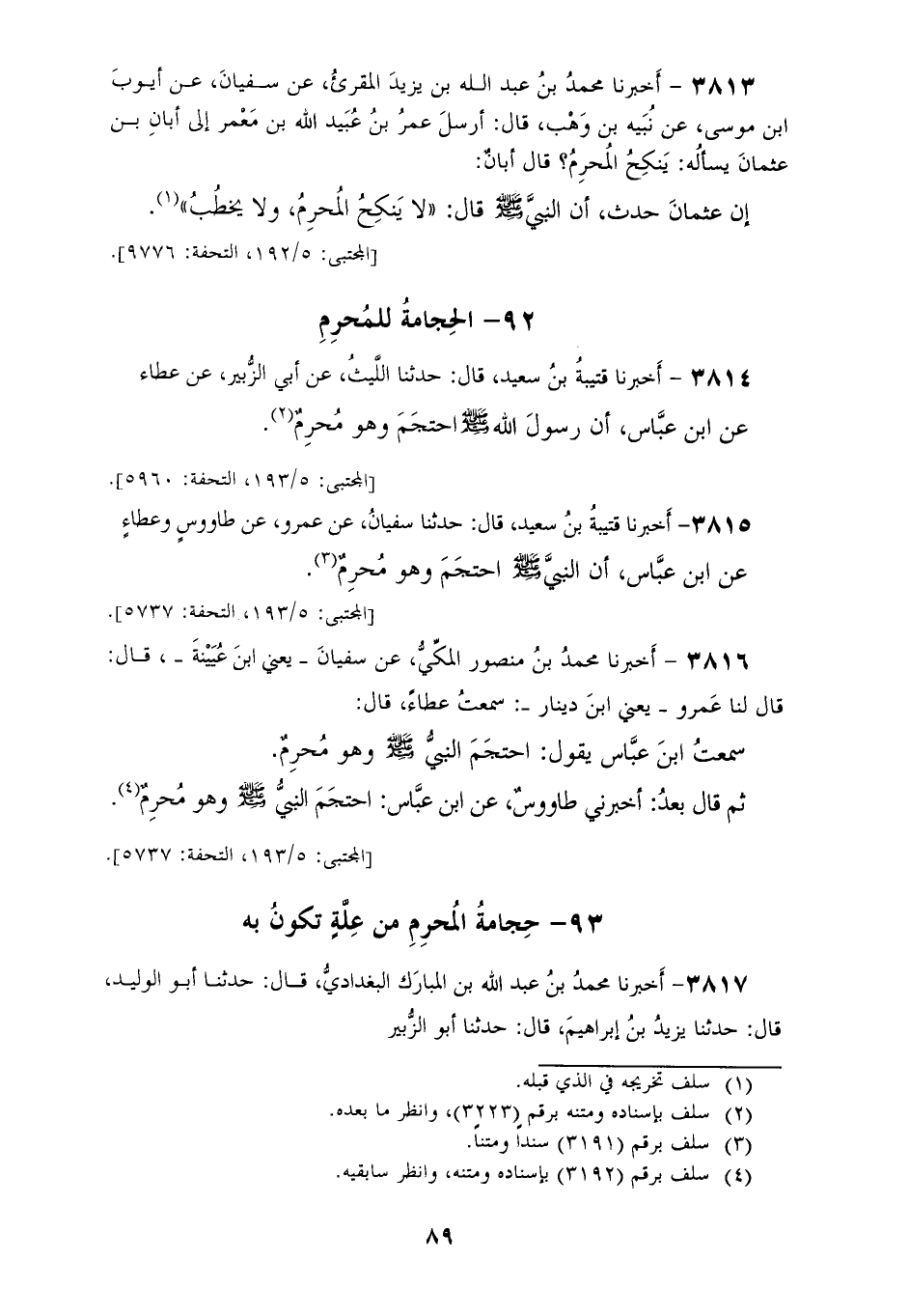 3815 - أَخْبَرَنَا قُتَيْبَةُ بْنُ سَعِيدٍ، قَالَ: حَدَّثَنَا سُفْيَانُ، عَنْ عَمْرٍو عَنْ طَاوُسٍ، وَعَطَاءٍ، عَنِ ابْنِ عَبَّاسٍ، أَنَّ النَّبِيَّ صَلَّى اللهُ عَلَيْهِ وَسَلَّمَ «§احْتَجَمَ وَهُوَ مُحْرِمٌ»