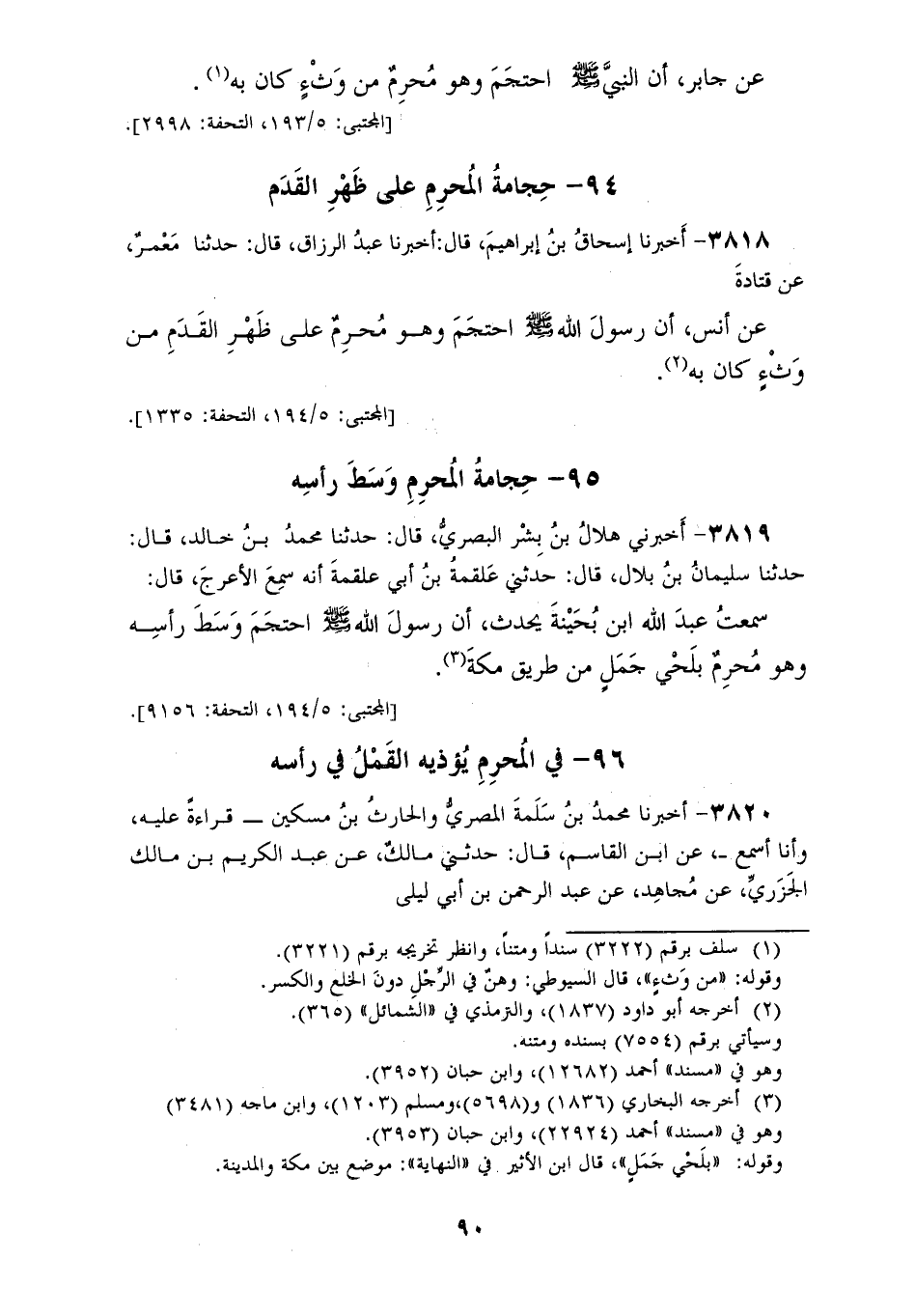 3818 - أَخْبَرَنَا إِسْحَاقُ بْنُ إِبْرَاهِيمَ، قَالَ: أَخْبَرَنَا عَبْدُ الرَّزَّاقِ، قَالَ: حَدَّثَنَا مَعْمَرٌ، عَنْ قَتَادَةَ، عَنْ أَنَسٍ، أَنَّ رَسُولَ اللهِ صَلَّى اللهُ عَلَيْهِ وَسَلَّمَ «§احْتَجَمَ وَهُوَ مُحْرِمٌ عَلَى ظَهْرِ الْقَدَمِ مِنْ وَثْءٍ كَانَ بِهِ.»