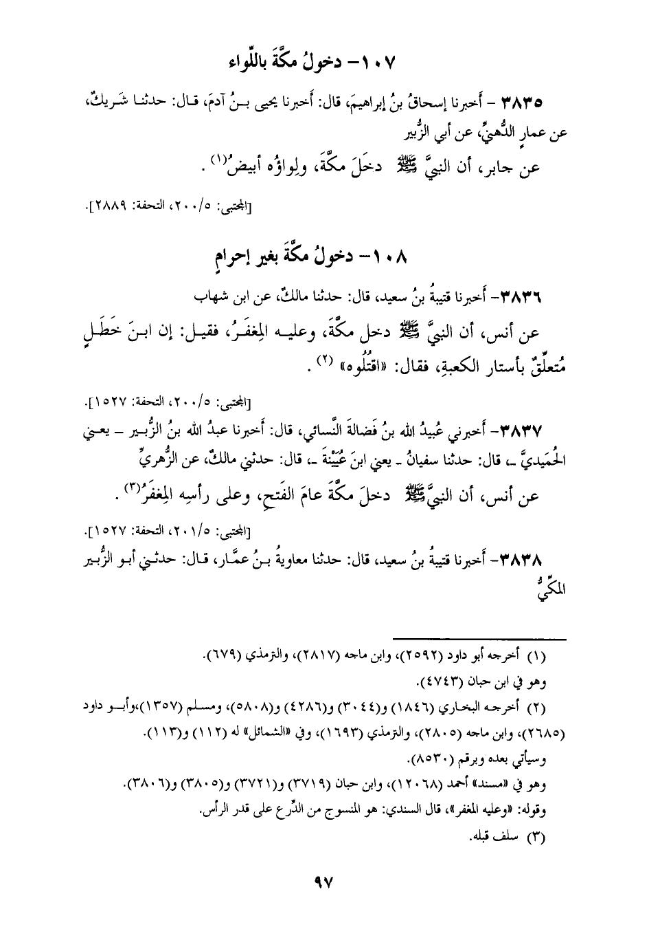 3838 - أَخْبَرَنَا قُتَيْبَةُ بْنُ سَعِيدٍ، قَالَ: حَدَّثَنَا مُعَاوِيَةُ بْنُ عَمَّارٍ، قَالَ: حَدَّثَنِي أَبُو الزُّبَيْرِ الْمَكِّيُّ، عَنْ جَابِرِ بْنِ عَبْدِ اللهِ، أَنَّ رَسُولَ اللهِ صَلَّى اللهُ عَلَيْهِ وَسَلَّمَ «§دَخَلَ يَوْمَ الْفَتْحِ مَكَّةَ وَعَلَيْهِ عِمَامَةٌ سَوْدَاءُ وَبِغَيْرِ إِحْرَامٍ»