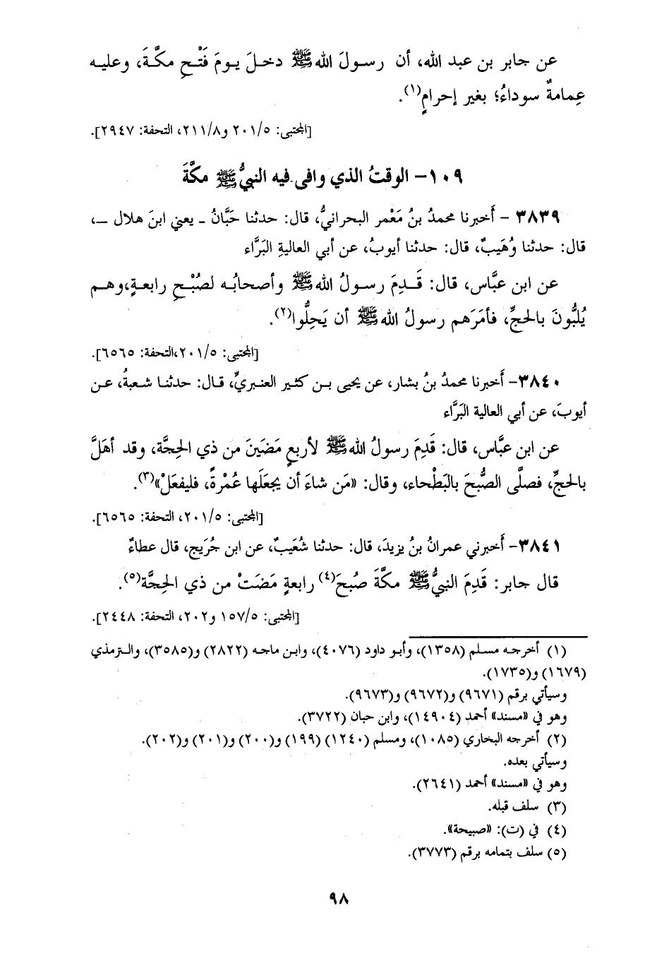 3841 - أَخْبَرَنِي عِمْرَانُ بْنُ يَزِيدَ، قَالَ: حَدَّثَنَا شُعَيْبٌ، عَنِ ابْنِ جُرَيْجٍ، قَالَ عَطَاءٌ: قَالَ جَابِرٌ: «§قَدِمَ النَّبِيُّ صَلَّى اللهُ عَلَيْهِ وَسَلَّمَ مَكَّةَ صَبِيحَةَ رَابِعَةٍ مَضَتْ مِنْ ذِي الْحِجَّةِ»