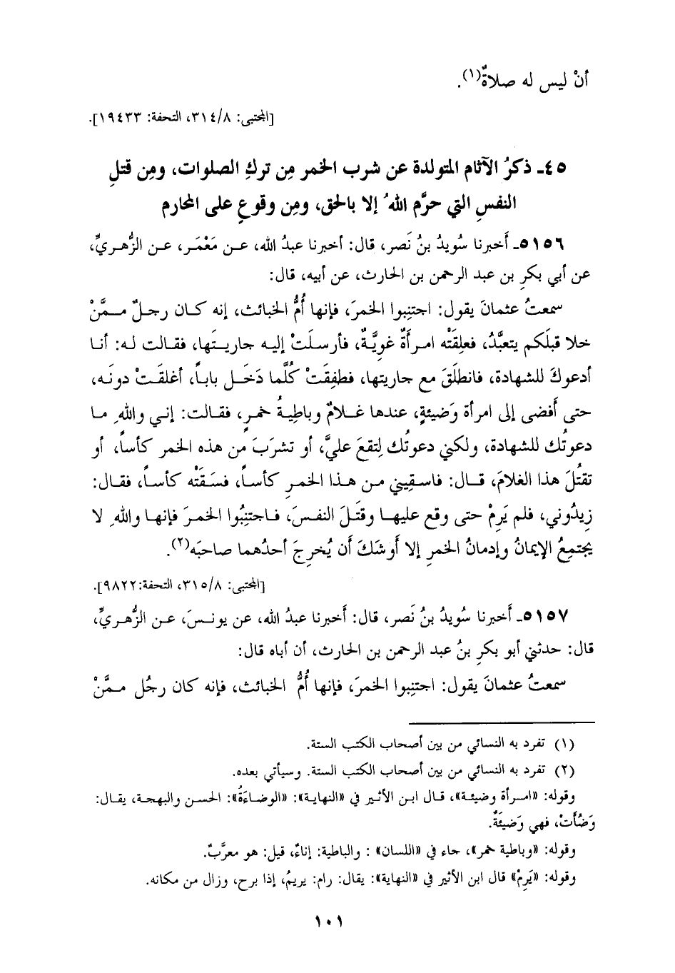 5156 - أَخْبَرَنَا سُوَيْدُ بْنُ نَصْرٍ، قَالَ: أَخْبَرَنَا عَبْدُ اللهِ، عَنْ مَعْمَرٍ، عَنِ الزُّهْرِيِّ، عَنْ أَبِي بَكْرِ بْنِ عَبْدِ الرَّحْمَنِ بْنِ الْحَارِثِ، عَنْ أَبِيهِ، قَالَ: سَمِعْتُ عُثْمَانَ يَقُولُ: " §اجْتَنِبُوا الْخَمْرَ فَإِنَّهَا أُمُّ الْخَبَائِثِ، إِنَّهُ كَانَ رَجُلٌ مِمَّنْ خَلَا قَبْلَكُمْ يَتَعَبَّدُ فَعَلِقَتْهُ امْرَأَةٌ غَوِيَّةٌ، فَأَرْسَلَتْ إِلَيْهِ جَارِيَتَهَا فَقَالَتْ لَهُ: أَنَا أَدْعُوكَ لِلشَّهَادَةِ فَانْطَلَقَ مَعَ جَارِيَتِهَا، فَطَفِقَتْ كُلَّمَا دَخَلَ بَابًا أَغْلَقَتْهُ دُونَهُ حَتَّى أَفْضَى إِلَى امْرَأَةٍ وَضِيئَةٍ عِنْدَهَا غُلَامٌ وَبَاطِيَةُ خَمْرٍ، فَقَالَتْ: إِنِّي وَاللهِ مَا دَعْوَتُكَ لِلشَّهَادَةِ، وَلَكِنْ دَعْوَتُكَ لِتَقَعَ عَلَيَّ أَوْ تَشْرَبَ مِنْ هَذِهِ الْخَمْرِ كَأْسًا أَوْ تَقْتُلَ هَذَا الْغُلَامَ، قَالَ: فَاسْقِينِي مِنْ هَذَا الْخَمْرِ كَأْسًا، فَسَقَتْهُ كَأْسًا، فَقَالَ: زِيدُونِي فَلَمْ يَرِمْ حَتَّى وَقَعَ عَلَيْهَا وَقَتَلَ النَّفْسَ، فَاجْتَنِبُوا الْخَمْرَ؛ فَإِنَّهَا وَاللهِ لَا يَجْتَمِعُ الْإِيمَانُ وَإِدْمَانُ الْخَمْرِ إِلَّا أَوْشَكَ أَنْ يُخْرِجَ أَحَدُهُمَا صَاحِبَهُ "
