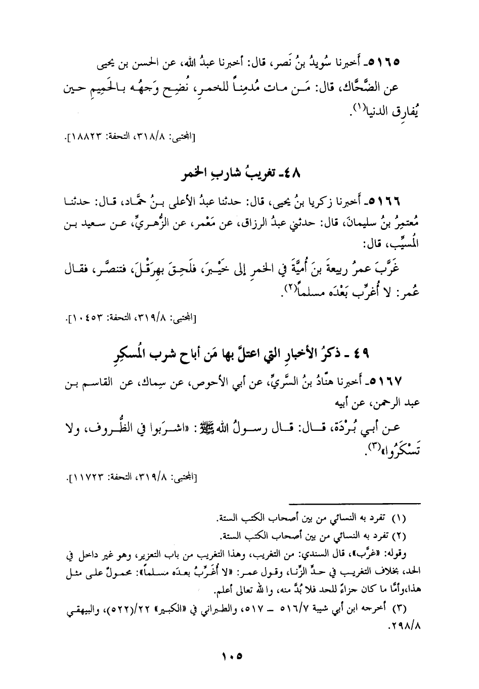 5165 - أَخْبَرَنَا سُوَيْدُ بْنُ نَصْرٍ، قَالَ: أَخْبَرَنَا عَبْدُ اللهِ، عَنِ الْحَسَنِ بْنِ يَحْيَى، عَنِ الضَّحَّاكِ، قَالَ: «§مَنْ مَاتَ مُدْمِنًا لِلْخَمْرِ نُضِحَ وَجْهُهُ بِالْحَمِيمِ حِينَ يُفَارِقُ الدُّنْيَا»
