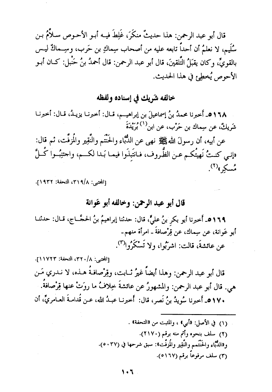 5168 - أَخْبَرَنَا مُحَمَّدُ بْنُ إِسْمَاعِيلَ بْنِ إِبْرَاهِيمَ، قَالَ: أَخْبَرَنَا يَزِيدُ، قَالَ: أَخْبَرَنَا شَرِيكٌ، عَنْ سِمَاكِ بْنِ حَرْبٍ، عَنِ ابْنِ بُرَيْدَةَ، عَنْ أَبِيهِ، أَنَّ رَسُولَ اللهِ صَلَّى اللهُ عَلَيْهِ وَسَلَّمَ §نَهَى عَنِ الدُّبَّاءِ، وَالْحَنْتَمِ، وَالنَّقِيرِ، وَالْمُزَفَّتِ، ثُمَّ قَالَ: «إِنِّي كُنْتُ نَهَيْتُكُمْ عَنِ الظُّرُوفِ فَانْتَبِذُوا فِيمَا بَدَا لَكُمْ وَاجْتَنِبُوا كُلَّ مُسْكِرٍ» قَالَ أَبُو عَبْدِ الرَّحْمَنِ: وَخَالَفَهُ أَبُو عَوَانَةَ
