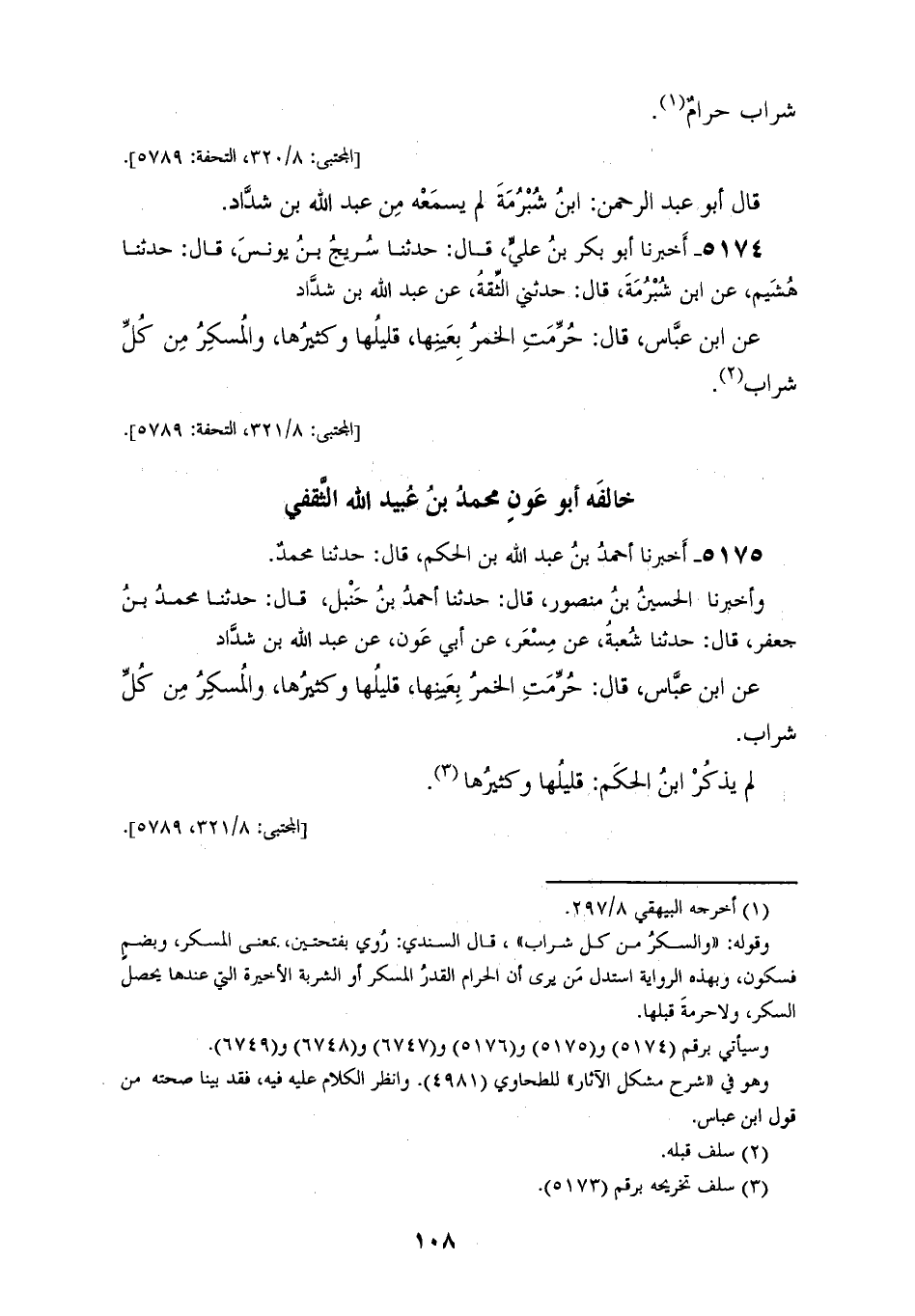 5174 - أَخْبَرَنَا أَبُو بَكْرِ بْنُ عَلِيٍّ، قَالَ: حَدَّثَنَا سُرَيْجُ بْنُ يُونُسَ، قَالَ: حَدَّثَنَا هُشَيْمٌ، عَنِ ابْنِ شُبْرُمَةَ، قَالَ: حَدَّثَنِي الثِّقَةُ، عَنْ عَبْدِ اللهِ بْنِ شَدَّادٍ، عَنِ ابْنِ عَبَّاسٍ، قَالَ: «§حُرِّمَتِ الْخَمْرُ بِعَيْنِهَا قَلِيلُهَا وَكَثِيرُهَا، وَالمُسْكِرُ مِنْ كُلِّ شَرَابٍ» خَالَفَهُ أَبُو عَوْنٍ مُحَمَّدُ بْنُ عُبَيْدِ اللهِ الثَّقَفِيُّ