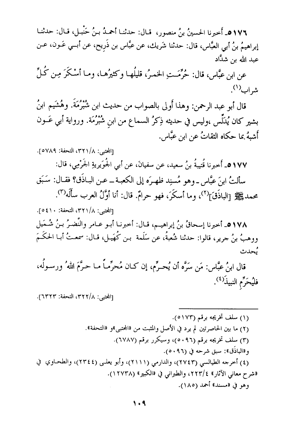 5178 - أَخْبَرَنَا إِسْحَاقُ بْنُ إِبْرَاهِيمَ، قَالَ: أَخْبَرَنَا أَبُو عَامِرٍ، وَالنَّضْرُ بْنُ شُمَيْلٍ، وَوَهْبُ بْنُ جَرِيرٍ، قَالُوا: حَدَّثَنَا شُعْبَةُ، عَنْ سَلَمَةَ بْنِ كُهَيْلٍ، قَالَ: سَمِعْتُ أَبَا الْحَكَمِ، يُحَدِّثُ: قَالَ ابْنُ عَبَّاسٍ: «§مَنْ سَرَّهُ أَنْ يُحَرِّمَ، إِنْ كَانَ مُحَرِّمًا مَا حَرَّمَ اللهُ وَرَسُولُهُ، فَلْيُحَرِّمِ النَّبِيذَ»