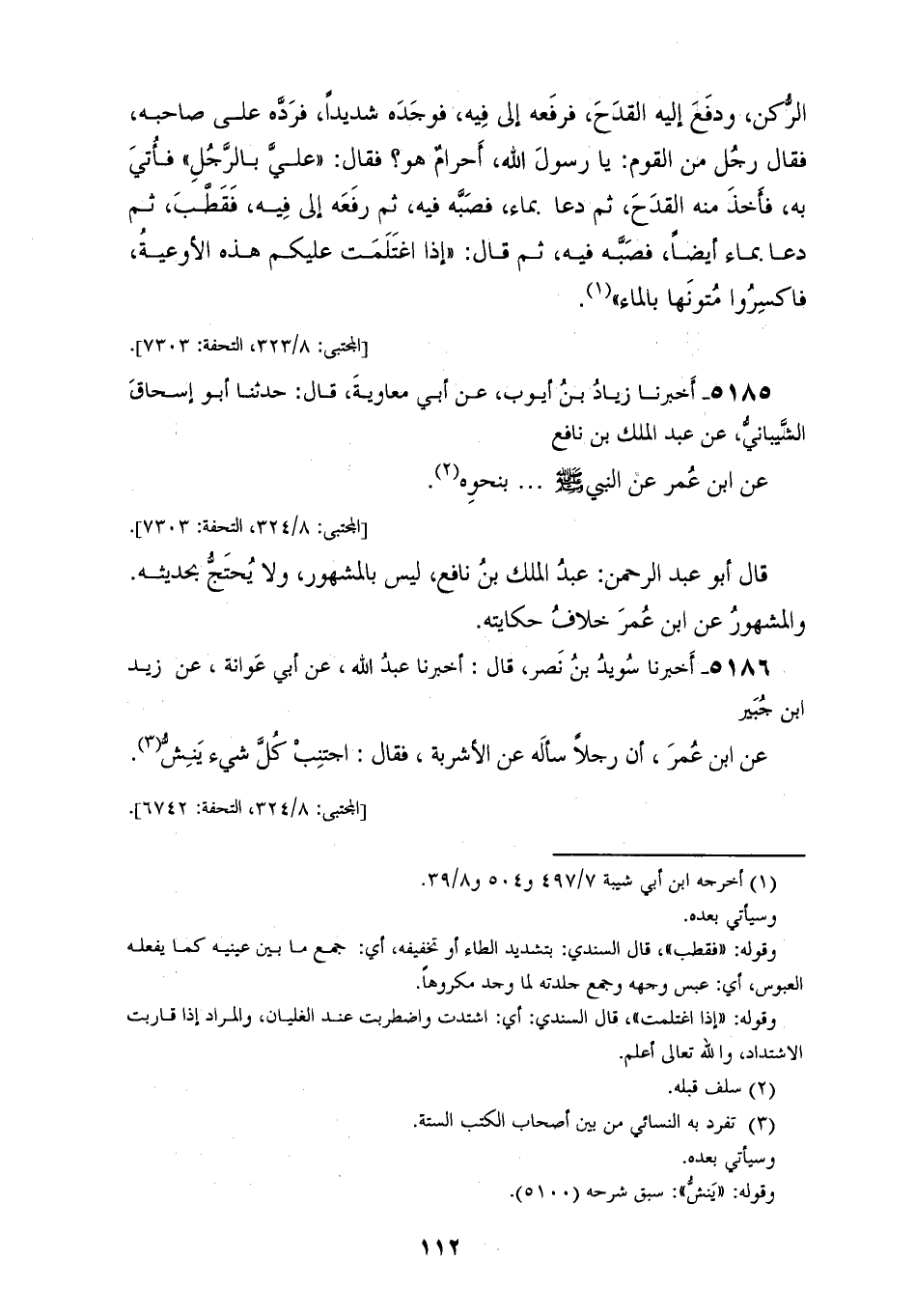 5184 - أَخْبَرَنَا زِيَادُ بْنُ أَيُّوبَ، قَالَ: حَدَّثَنَا هُشَيْمٌ، قَالَ: أَخْبَرَنَا الْعَوَّامُ، عَنْ عَبْدِ الْمَلِكِ بْنِ نَافِعٍ، قَالَ: قَالَ ابْنُ عُمَرَ: رَأَيْتُ رَجُلًا جَاءَ إِلَى رَسُولِ اللهِ صَلَّى اللهُ عَلَيْهِ وَسَلَّمَ بِقَدَحٍ فِيهِ نَبِيذٌ، وَهُوَ عِنْدَ الرُّكْنِ وَدَفَعَ إِلَيْهِ الْقَدَحَ، فَرَفَعَهُ إِلَى فِيهِ فَوَجَدَهُ شَدِيدًا فَرَدَّهُ عَلَى صَاحِبِهِ، فَقَالَ لَهُ رَجُلٌ مِنَ الْقَوْمِ: يَا رَسُولَ اللهِ أَحَرَامٌ هُوَ؟ فَقَالَ: «عَلَيَّ بِالرَّجُلِ» فَأُتِيَ بِهِ فَأَخَذَ مِنْهُ الْقَدَحَ، ثُمَّ دَعَا بِمَاءٍ فَصَبَّهُ فِيهِ ثُمَّ رَفَعَهُ إِلَى فِيهِ فَقَطَّبَ، ثُمَّ دَعَا بِمَاءٍ أَيْضًا فَصَبَّهُ فِيهِ ثُمَّ قَالَ: «§إِذَا اغْتَلَمَتْ عَلَيْكُمْ هَذِهِ الْأَوْعِيَةُ، فَاكْسِرُوا مُتُونَهَا بِالْمَاءِ»