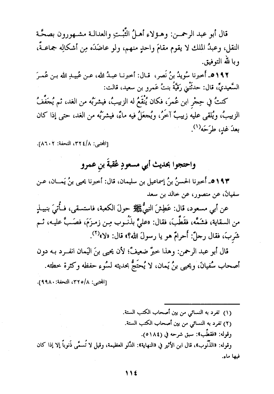 5193 - أَخْبَرَنَا الْحَسَنُ بْنُ إِسْمَاعِيلَ بْنِ سُلَيْمَانَ، قَالَ: أَخْبَرَنَا يَحْيَى بْنُ يَمَانٍ، عَنْ سُفْيَانَ، عَنْ مَنْصُورٍ، عَنْ خَالِدِ بْنِ سَعْدٍ، عَنْ أَبِي مَسْعُودٍ، قَالَ: عَطِشَ النَّبِيُّ صَلَّى اللهُ عَلَيْهِ وَسَلَّمَ حَوْلَ الْكَعْبَةِ فَاسْتَسْقَى فَأُتِيَ بِنَبِيذٍ مِنَ السِّقَايَةِ فَشَمَّهُ فَقَطَّبَ، فَقَالَ: «§عَلَيَّ بِذَنُوبٍ مِنْ زَمْزَمَ»، فَصَبَّ عَلَيْهِ ثُمَّ شَرِبَ، فَقَالَ رَجُلٌ: أَحَرَامٌ هُوَ يَا رَسُولَ اللهِ؟ قَالَ: «لَا» قَالَ أَبُو عَبْدِ الرَّحْمَنِ: وَهَذَا خَبَرٌ ضَعِيفٌ؛ لِأَنَّ يَحْيَى بْنَ الْيَمَانٍ انْفَرَدَ بِهِ دُونَ أَصْحَابِ سُفْيَانَ، وَيَحْيَى بْنُ يَمَانٍ لَا يُحْتَجُّ بِحَدِيثِهِ لِسُوءِ حِفْظِهِ وَكَثْرَةِ خَطَئِهِ