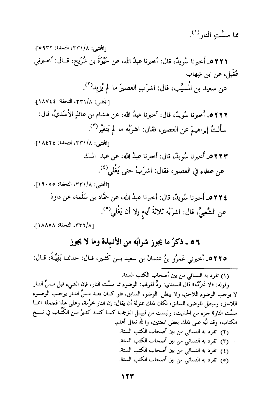 5222 - أَخْبَرَنَا سُوَيْدٌ، قَالَ: أَخْبَرَنَا عَبْدُ اللهِ، عَنْ هِشَامِ بْنِ عَائِذٍ الْأَسَدِيِّ، قَالَ: سَأَلْتُ إِبْرَاهِيمَ عَنِ الْعَصِيرِ، فَقَالَ: «§اشْرَبْهُ مَا لَمْ يَتَغَيَّرْ»