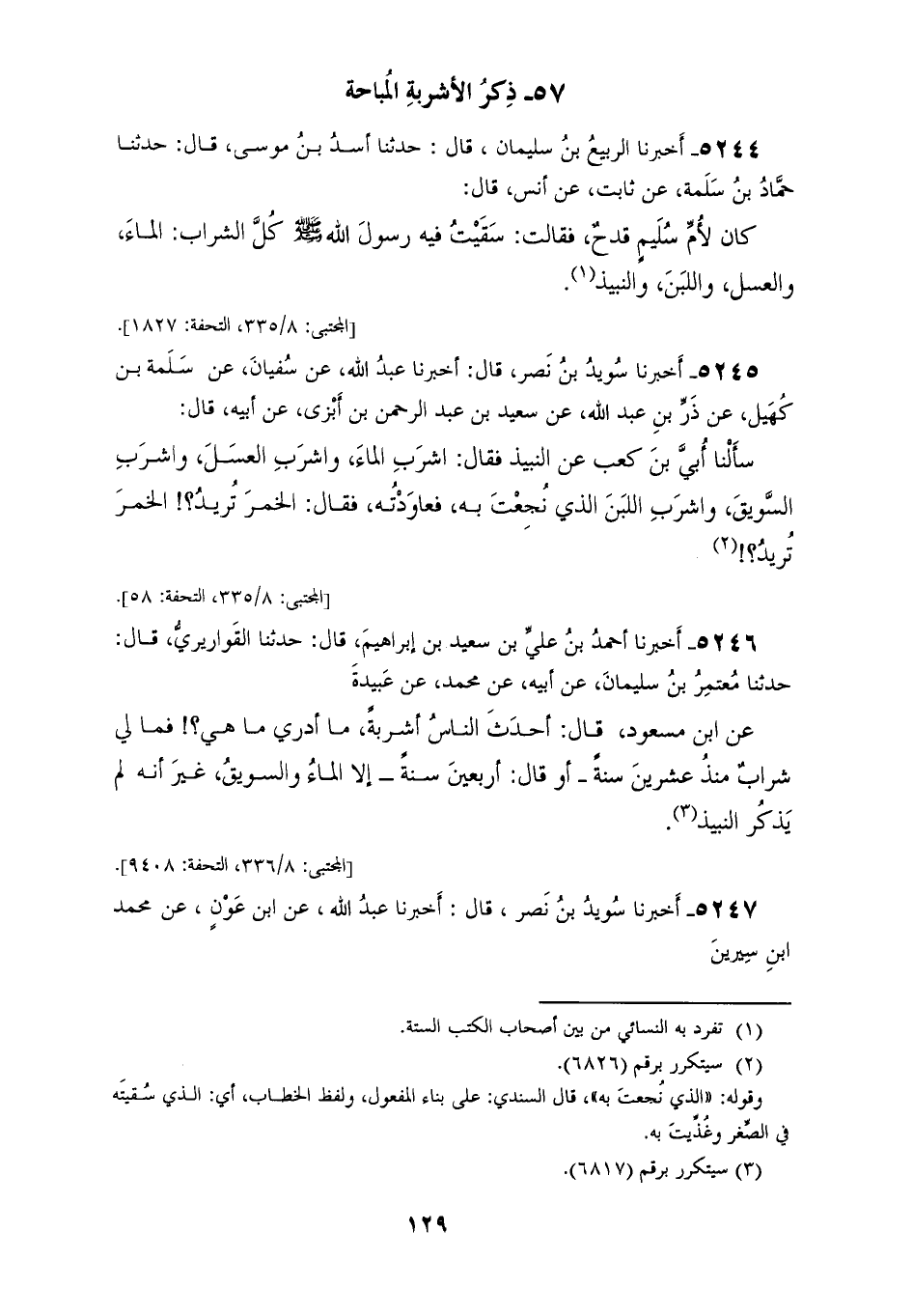 5246 - أَخْبَرَنَا أَحْمَدُ بْنُ عَلِيِّ بْنِ سَعِيدِ بْنِ إِبْرَاهِيمَ، قَالَ: حَدَّثَنَا الْقَوَارِيرِيُّ، قَالَ: حَدَّثَنَا مُعْتَمِرُ بْنُ سُلَيْمَانَ، عَنْ أَبِيهِ، عَنْ مُحَمَّدِ، عَنْ عَبِيدَةَ، عَنِ ابْنِ مَسْعُودٍ، قَالَ: " §أَحْدَثَ النَّاسُ أَشْرِبَةً مَا أَدْرِي مَا هِيَ، فَمَا لِي شَرَابٌ مُنْذُ عِشْرِينَ سَنَةً، أَوْ قَالَ: أَرْبَعِينَ سَنَةً، إِلَّا الْمَاءُ وَالسَّوِيقُ، غَيْرَ أَنَّهُ لَمْ يَذْكُرِ النَّبِيذَ "