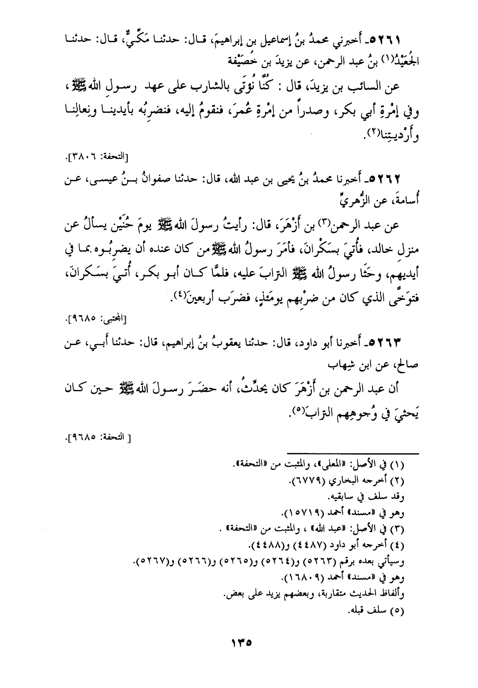 5262 - أَخْبَرَنَا مُحَمَّدُ بْنُ يَحْيَى بْنِ عَبْدِ اللهِ، قَالَ: حَدَّثَنَا صَفْوَانُ بْنُ عِيسَى، عَنْ أُسَامَةَ، عَنِ الزُّهْرِيِّ، عَنْ عَبْدِ الرَّحْمَنِ بْنِ أَزْهَرَ، قَالَ: رَأَيْتُ رَسُولَ اللهِ صَلَّى اللهُ عَلَيْهِ وَسَلَّمَ يَوْمَ حُنَيْنٍ يَسْأَلُ عَنْ مَنْزِلِ خَالِدٍ، فَأُتِيَ بِسَكْرَانَ «§فَأَمَرَ رَسُولُ اللهِ صَلَّى اللهُ عَلَيْهِ وَسَلَّمَ مَنْ كَانَ عِنْدَهُ أَنْ يَضْرِبُوهُ بِمَا فِي أَيْدِيهِمْ، وَحَثَا رَسُولُ اللهِ صَلَّى اللهُ عَلَيْهِ وَسَلَّمَ التُّرَابَ عَلَيْهِ، فَلَمَّا كَانَ أَبُو بَكْرٍ أُتِيَ بِسَكْرَانَ فَتَوَخَّى الَّذِي كَانَ مِنْ ضَرْبِهِمْ يَوْمَئِذٍ فَضَرَبَ أَرْبَعِينَ»