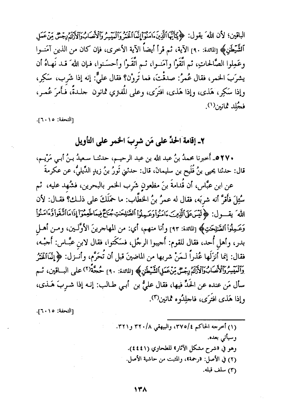 5270 - أَخْبَرَنَا مُحَمَّدُ بْنُ عَبْدِ اللهِ بْنِ عَبْدِ الرَّحِيمِ، قَالَ: حَدَّثَنَا سَعِيدُ بْنُ أَبِي مَرْيَمَ، قَالَ: حَدَّثَنَا يَحْيَى بْنُ فُلَيْحِ بْنُ سُلَيْمَانَ، قَالَ: حَدَّثَنِي ثَوْرُ بْنُ زَيْدٍ الدِّيلِيُّ، عَنْ عِكْرِمَةَ، عَنِ ابْنِ عَبَّاسٍ، أَنَّ قُدَامَةَ بْنَ مَظْعُونٍ، شَرِبَ الْخَمْرَ بِالْبَحْرَيْنِ فَشَهِدَ عَلَيْهِ ثُمَّ سُئِلَ فَأَقَرَّ أَنَّهُ شَرِبَهُ، فَقَالَ لَهُ عُمَرُ بْنُ الْخَطَّابِ: §مَا حَمَلَكَ عَلَى ذَلِكَ، فَقَالَ: لَأَنَّ اللهَ يَقُولُ: {لَيْسَ عَلَى الَّذِينَ آمَنُوا وَعَمِلُوا الصَّالِحَاتِ جُنَاحٌ، فِيمَا طَعِمُوا إِذَا مَا اتَّقَوْا وَآمَنُوا، وَعَمِلُوا الصَّالِحَاتِ} [المائدة: 93]، وَأَنَا مِنْهُمْ أَيْ مِنَ الْمُهَاجِرِينِ الْأَوَّلِينَ، وَمِنْ أَهْلِ بَدْرٍ، وَأَهْلِ أُحُدٍ، فَقَالَ: لِلْقَوْمِ أَجِيبُوا الرَّجُلَ فَسَكَتُوا، فَقَالَ لِابْنِ عَبَّاسٍ: أَجِبْهُ، فَقَالَ: إِنَّمَا أَنْزَلَهَا عُذْرًا لِمَنْ شَرِبَهَا مِنَ الْمَاضِينَ قَبْلَ أَنْ تُحَرَّمَ وَأَنْزَلَ: {إِنَّمَا الْخَمْرُ وَالْمَيْسِرُ وَالْأَنْصَابُ وَالْأَزْلَامُ رِجْسٌ} [المائدة: 90] مِنْ عَمَلِ الشَّيْطَانِ، حُجَّةٌ عَلَى الْبَاقِينَ ثُمَّ سَأَلَ مَنْ عِنْدَهُ عَنِ الْحَدِّ فِيهَا، فَقَالَ عَلِيُّ بْنُ أَبِي طَالِبٍ: إِنَّهُ إِذَا شَرِبَ هَذِيَ، وَإِذَا هَذِيَ افْتَرَى فَاجْلِدُوهُ ثَمَانِينَ