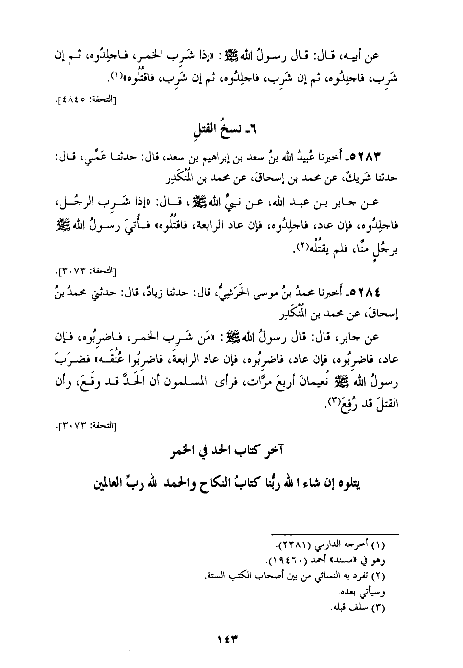 5284 - أَخْبَرَنَا مُحَمَّدُ بْنُ مُوسَى الْحَرَشِيُّ، قَالَ: حَدَّثَنَا زِيَادٌ، قَالَ: حَدَّثَنِي مُحَمَّدُ بْنُ إِسْحَاقَ، عَنْ مُحَمَّدِ بْنِ الْمُنْكَدِرِ، عَنْ جَابِرٍ، قَالَ: قَالَ رَسُولُ اللهِ صَلَّى اللهُ عَلَيْهِ وَسَلَّمَ: «§مَنْ شَرِبَ الْخَمْرَ فَاضْرِبُوهُ، فَإِنْ عَادَ فَاضْرِبُوهُ، فَإِنْ عَادَ فَاضْرِبُوهُ، فَإِنْ عَادَ الرَّابِعَةَ فَاضْرِبُوا عُنُقَهُ»، فَضَرَبَ رَسُولُ اللهِ صَلَّى اللهُ عَلَيْهِ وَسَلَّمَ نُعَيْمَانَ أَرْبَعَ مَرَّاتٍ، فَرَأَى الْمُسْلِمُونَ أَنَّ الْحَدَّ قَدْ وَقَعَ، وَأَنَّ الْقَتْلَ قَدْ رُفِعَ