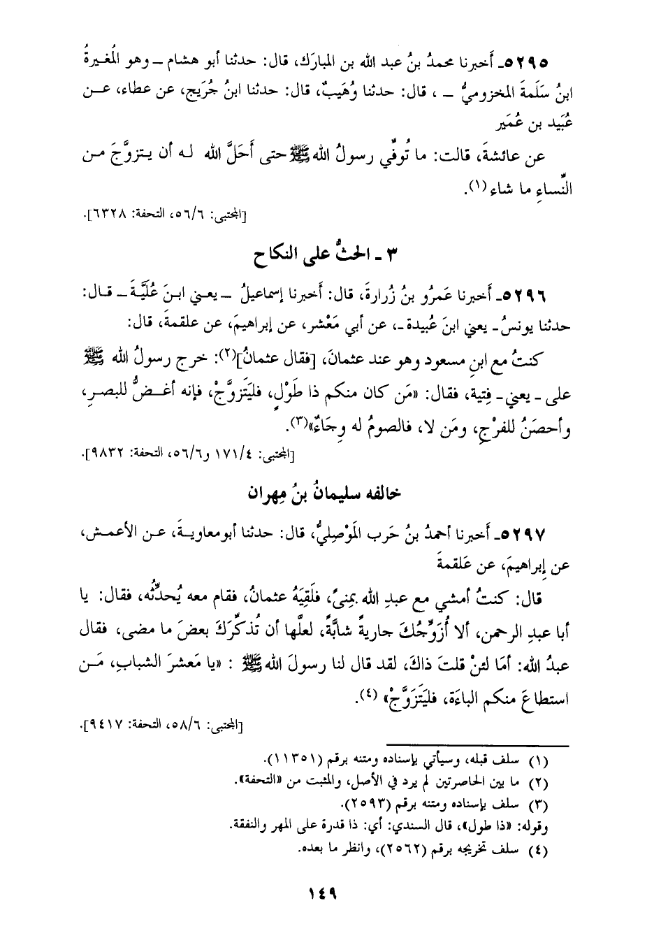 5297 - أَخْبَرَنَا أَحْمَدُ بْنُ حَرْبٍ الْمَوْصِلِيُّ، قَالَ: حَدَّثَنَا أَبُو مُعَاوِيَةَ، عَنِ الْأَعْمَشِ، عَنْ إِبْرَاهِيمَ، عَنْ عَلْقَمَةَ، قَالَ: «§كُنْتُ أَمْشِي مَعَ عَبْدِ اللهِ بِمِنًى فَلَقِيَهُ عُثْمَانُ فَقَامَ مَعَهُ يُحَدِّثُهُ» فَقَالَ: يَا أَبَا عَبْدِ الرَّحْمَنِ أَلَا أُزَوِّجُكَ جَارِيَةً شَابَّةً، فَلَعَلَّهَا أَنْ تُذَكِّرَكَ بَعْضَ مَا مَضَى مِنْكَ، فَقَالَ عَبْدُ اللهِ: أَمَّا لَئِنْ قُلْتَ ذَاكَ لَقَدْ قَالَ لَنَا رَسُولُ اللهِ صَلَّى اللهُ عَلَيْهِ وَسَلَّمَ: «يَا مَعْشَرَ الشَّبَابِ مَنِ اسْتَطَاعَ مِنْكُمُ الْبَاءَةَ فَلْيَتَزَوَّجْ»
