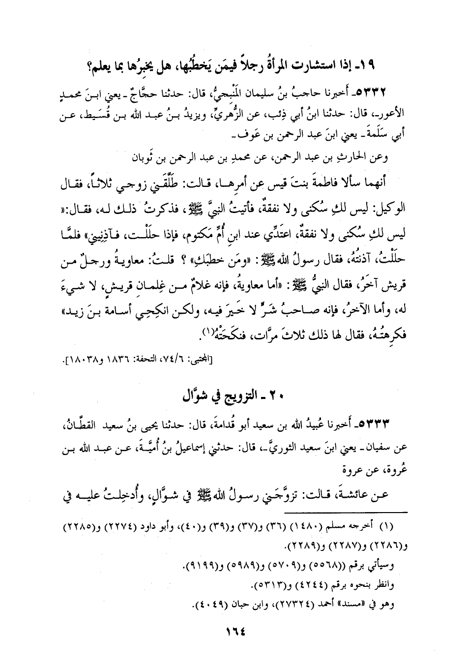 5332 - أَخْبَرَنَا حَاجِبُ بْنُ سُلَيْمَانَ الْمَنْبِجِيُّ، قَالَ: حَدَّثَنَا حَجَّاجٌ يَعْنِي ابْنَ مُحَمَّدٍ الْأَعْوَرَ، قَالَ: حَدَّثَنَا ابْنُ أَبِي ذِئْبٍ، عَنِ الزُّهْرِيِّ، وَيَزِيدُ بْنُ عَبْدِ اللهِ بْنِ قُسَيْطٍ، عَنْ أَبِي سَلَمَةَ يَعْنِي ابْنَ عَبْدِ الرَّحْمَنِ بْنِ عَوْفٍ، وَعَنِ الْحَارِثِ بْنِ عَبْدِ الرَّحْمَنِ، عَنْ مُحَمَّدِ بْنِ عَبْدِ الرَّحْمَنِ بْنِ ثَوْبَانَ، أَنَّهُمَا سَأَلَا فَاطِمَةَ بِنْتَ قَيْسٍ عَنْ أَمْرِهَا، فَقَالَتْ: طَلَّقَنِي زَوْجِي ثَلَاثًا، فَقَالَ الْوَكِيلُ: لَيْسَ لَكِ سُكْنَى وَلَا نَفَقَةٌ، قَالَتْ: فَأَتَيْتُ النَّبِيَّ صَلَّى اللهُ عَلَيْهِ وَسَلَّمَ فَذَكَرْتُ ذَلِكَ لَهُ، فَقَالَ: «§لَيْسَ لَكِ سُكْنَى، وَلَا نَفَقَةٌ اعْتَدِّي عِنْدَ ابْنِ أُمِّ مَكْتُومٍ، فَإِذَا حَلَلْتِ فَآذِنِينِي» قَالَتْ: فَلَمَّا حَلَلْتُ آذَنْتُهُ، فَقَالَ رَسُولُ اللهِ صَلَّى اللهُ عَلَيْهِ وَسَلَّمَ: «وَمَنْ خَطَبَكِ؟» فَقُلْتُ: مُعَاوِيَةُ وَرَجُلٌ آخَرُ مِنْ قُرَيْشٍ، فَقَالَ النَّبِيُّ صَلَّى اللهُ عَلَيْهِ وَسَلَّمَ: «أَمَّا مُعَاوِيَةُ فَإِنَّهُ غُلَامٌ مِنْ غِلْمَانِ قُرَيْشٍ لَا شَيْءَ لَهُ، وَأَمَّا الْآخَرُ فَإِنَّهُ صَاحِبُ شَرٍّ لَا خَيْرَ فِيهِ، وَلَكِنِ انْكِحِي أُسَامَةَ بْنَ زَيْدٍ»، فَكَرِهْتُهُ، فَقَالَ: ذَلِكَ ثَلَاثَ مَرَّاتٍ فَنَكَحْتُهُ