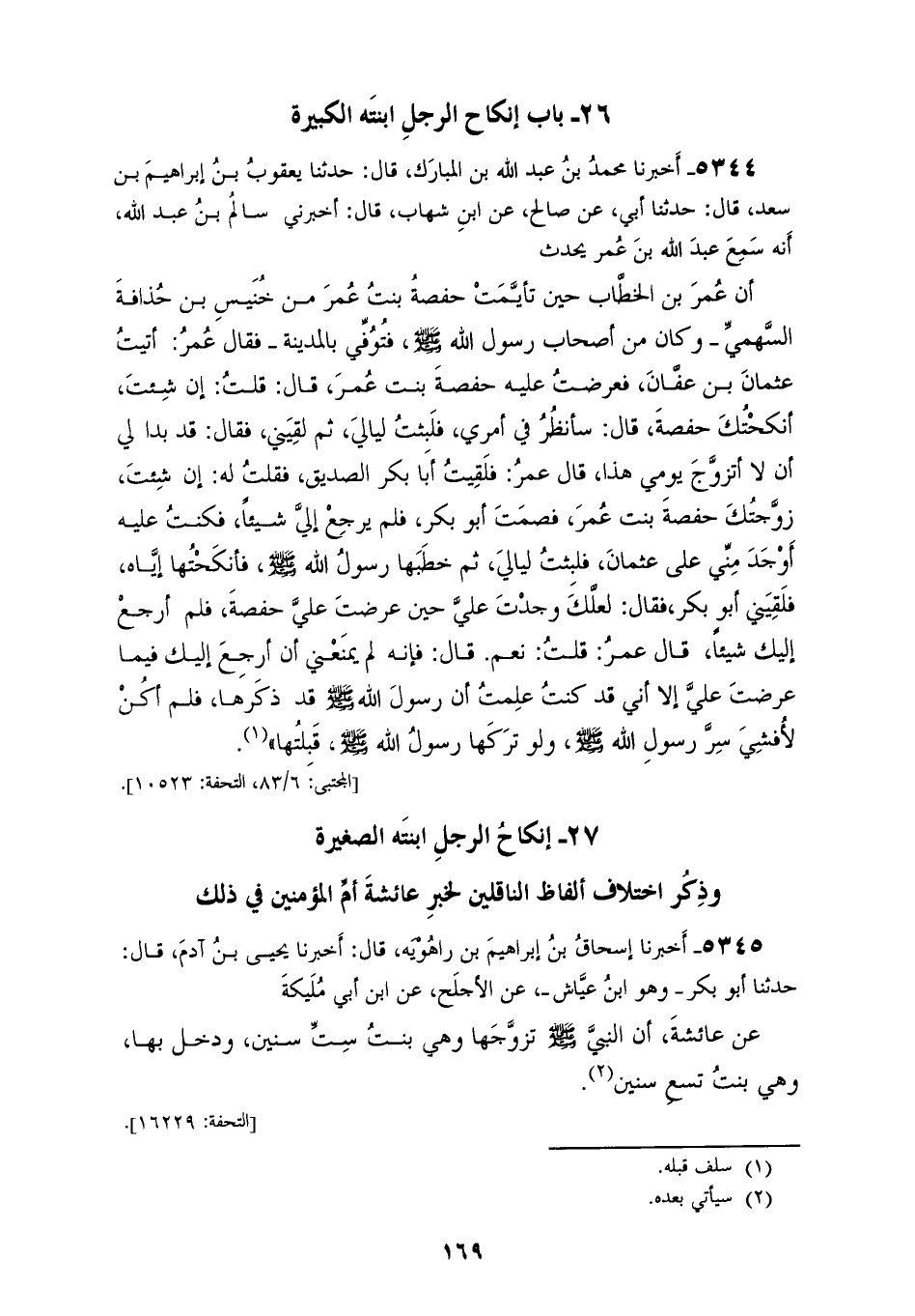 5344 - أَخْبَرَنَا مُحَمَّدُ بْنُ عَبْدِ اللهِ بْنِ الْمُبَارَكِ، قَالَ: حَدَّثَنَا يَعْقُوبُ بْنُ إِبْرَاهِيمَ بْنِ سَعْدٍ، قَالَ: حَدَّثَنَا أَبِي، عَنْ صَالِحٍ، عَنِ ابْنِ شِهَابٍ، قَالَ: أَخْبَرَنِي سَالِمُ بْنُ عَبْدِ اللهِ، أَنَّهُ سَمِعَ عَبْدَ اللهِ بْنَ عُمَرَ، يُحَدِّثُ أَنَّ عُمَرَ بْنَ الْخَطَّابِ حِينَ تَأَيَّمَتْ حَفْصَةُ بِنْتُ عُمَرَ مِنْ خُنَيْسِ بْنِ حُذَافَةَ السَّهْمِيِّ، وَكَانَ مِنْ أَصْحَابِ رَسُولِ اللهِ صَلَّى اللهُ عَلَيْهِ وَسَلَّمَ، فَتُوُفِّيَ بِالْمَدِينَةِ، فَقَالَ عُمَرُ: §فَأَتَيْتُ عُثْمَانَ بْنَ عَفَّانَ، فَعَرَضْتُ عَلَيْهِ حَفْصَةَ بِنْتَ عُمَرَ، قَالَ: قُلْتُ: إِنْ شِئْتَ أَنْكَحْتُكَ حَفْصَةَ، قَالَ: سَأَنْظُرُ فِي أَمْرِي، فَلَبِثْتُ لَيَالِي ثُمَّ لَقِيَنِي، فَقَالَ: قَدْ بَدَا لِي أَنْ لَا أَتَزَوَّجَ يَوْمِي هَذَا، قَالَ عُمَرُ: فَلَقِيتُ أَبَا بَكْرٍ الصِّدِّيقَ فَقُلْتُ لَهُ: إِنْ شِئْتَ زَوَّجْتُكَ حَفْصَةَ بِنْتَ عُمَرَ، فَصَمَتَ أَبُو بَكْرٍ فَلَمْ يَرْجِعْ إِلَيَّ شَيْئًا، فَكُنْتُ عَلَيْهِ أَوْجَدَ مِنِّي عَلَى عُثْمَانَ فَلَبِثْتُ لَيَالِيَ ثُمَّ خَطَبَهَا رَسُولُ اللهِ صَلَّى اللهُ عَلَيْهِ وَسَلَّمَ فَأَنْكَحْتُهَا إِيَّاهُ، فَلَقِيَنِي أَبُو بَكْرٍ، فَقَالَ: لَعَلَّكَ وَجَدْتَ عَلَيَّ حِينَ عَرَضْتَ عَلَيَّ حَفْصَةَ فَلَمْ أَرْجِعْ إِلَيْكَ شَيْئًا، قَالَ عُمَرُ: قُلْتُ: نَعَمْ، قَالَ: فَإِنَّهُ لَمْ يَمْنَعْنِي أَنْ أَرْجِعَ إِلَيْكَ فِيمَا عَرَضْتَ عَلَيَّ إِلَّا أَنِّي قَدْ كُنْتُ عَلِمْتُ أَنَّ رَسُولَ اللهِ صَلَّى اللهُ عَلَيْهِ وَسَلَّمَ «قَدْ ذَكَرَهَا، فَلَمْ أَكُنْ لِأُفْشِيَ سِرَّ رَسُولِ اللهِ صَلَّى اللهُ عَلَيْهِ وَسَلَّمَ، وَلَوْ تَرَكَهَا رَسُولُ اللهِ صَلَّى اللهُ عَلَيْهِ وَسَلَّمَ قَبِلْتُهَا»