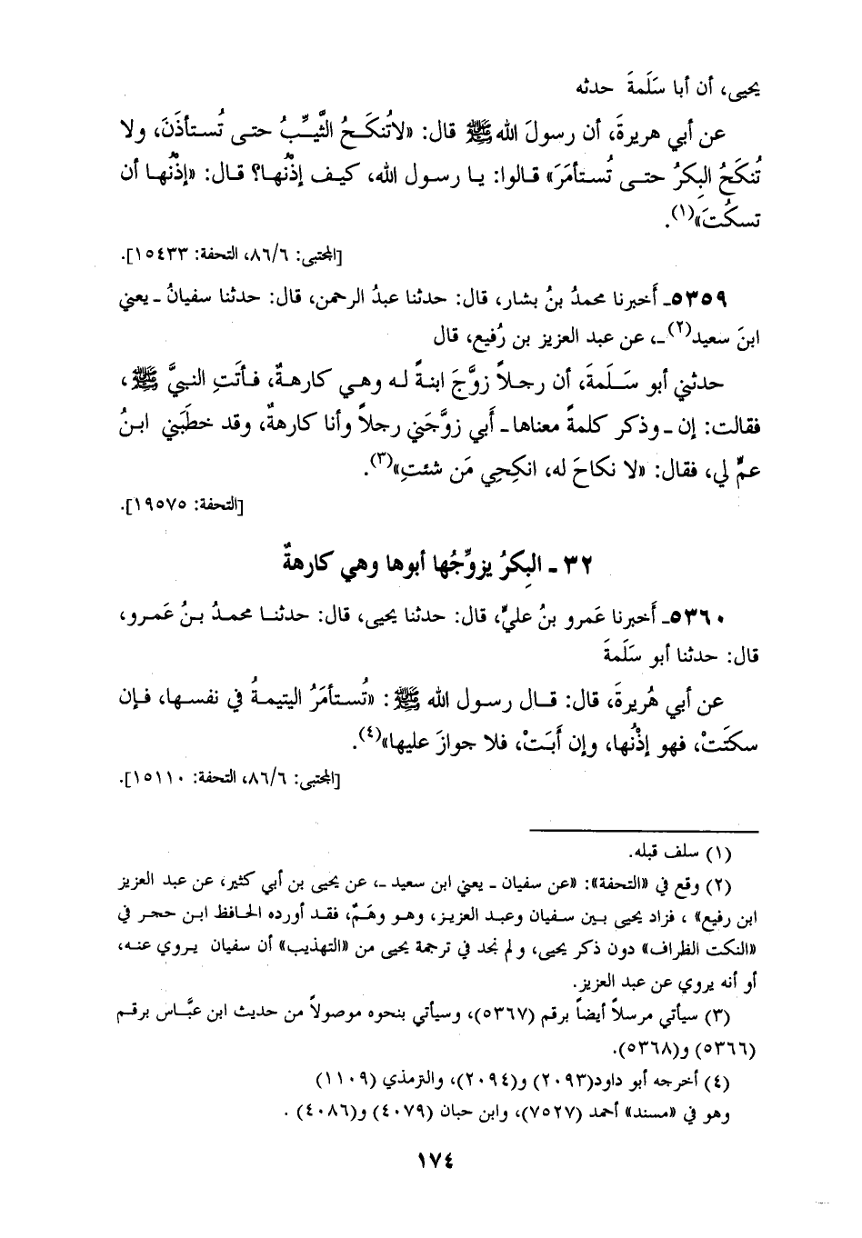 5358 - أَخْبَرَنَا يَحْيَى بْنُ دُرُسْتَ الْبَصْرِيُّ، قَالَ: حَدَّثَنَا أَبُو إِسْمَاعِيلَ، قَالَ: حَدَّثَنَا يَحْيَى، أَنَّ أَبَا سَلَمَةَ، حَدَّثَهُ عَنْ أَبِي هُرَيْرَةَ، أَنَّ رَسُولَ اللهِ صَلَّى اللهُ عَلَيْهِ وَسَلَّمَ قَالَ: «§لَا تُنْكَحُ الثَّيِّبُ حَتَّى تُسْتَأْذَنَ، وَلَا تُنْكَحُ الْبِكْرُ حَتَّى تُسْتَأْمَرَ»، قَالُوا: يَا رَسُولَ اللهِ كَيْفَ إِذْنُهَا؟، قَالَ: «إِذْنُهَا أَنْ تَسْكُتَ»