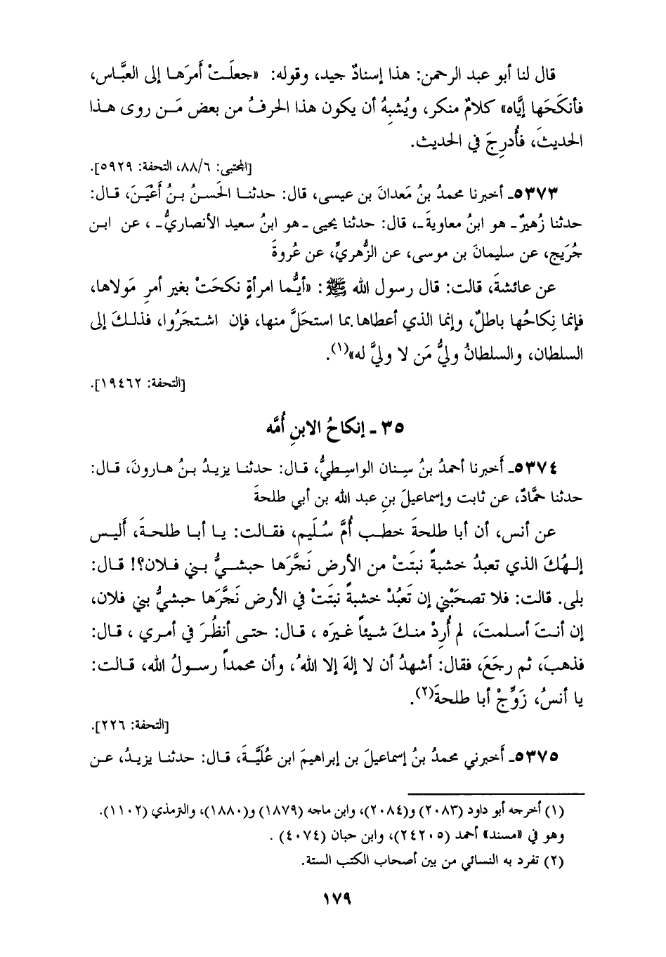 5374 - أَخْبَرَنَا أَحْمَدُ بْنُ سِنَانٍ الْوَاسِطِيُّ، قَالَ: حَدَّثَنَا يَزِيدُ بْنُ هَارُونَ، قَالَ: حَدَّثَنَا حَمَّادٌ، عَنْ ثَابِتٍ، وَإِسْمَاعِيلُ بْنُ عَبْدِ اللهِ بْنِ أَبِي طَلْحَةَ، عَنْ أَنَسٍ، أَنَّ أَبَا طَلْحَةَ، خَطَبَ أُمَّ سُلَيْمٍ، فَقَالَتْ: يَا أَبَا طَلْحَةَ أَلَيْسَ إِلَهُكُمُ الَّذِي تَعْبُدُ خَشَبَةً نَبَتَتْ مِنَ الْأَرْضِ نَجَرَهَا حَبَشِيُّ بَنِي فُلَانٍ؟، قَالَ: بَلَى، قَالَتْ: فَلَا تَصْحَبْنِي إِنْ تَعْبُدْ خَشَبَةً نَبَتَتْ فِي الْأَرْضِ نَجَرَهَا حَبَشِيُّ بَنِي فُلَانٍ إِنْ أَنْتَ أَسْلَمْتَ لَمْ أُرِدْ مِنْكَ شَيْئًا غَيْرَهُ، قَالَ: حَتَّى أَنْظُرَ فِي أَمْرِي، قَالَ: فَذَهَبَ ثُمَّ رَجَعَ، فَقَالَ: «§أَشْهَدُ أَنَّ لَا إِلَهَ إِلَّا اللهُ، وَأَنَّ مُحَمَّدًا رَسُولُ اللهِ»، قَالَتْ: يَا أَنَسُ زَوِّجْ أَبَا طَلْحَةَ