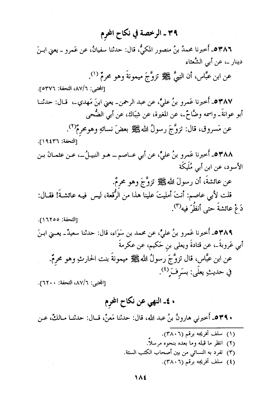 5386 - أَخْبَرَنَا مُحَمَّدُ بْنُ مَنْصُورٍ الْمَكِّيُّ، قَالَ: حَدَّثَنَا سُفْيَانُ، عَنْ عَمْرٍو يَعْنِي ابْنَ دِينَارٍ، عَنْ أَبِي الشَّعْثَاءِ، عَنِ ابْنَ عَبَّاسٍ، أَنَّ النَّبِيَّ صَلَّى اللهُ عَلَيْهِ وَسَلَّمَ «§تَزَوَّجَ مَيْمُونَةَ وَهُوَ مُحْرِمٌ»