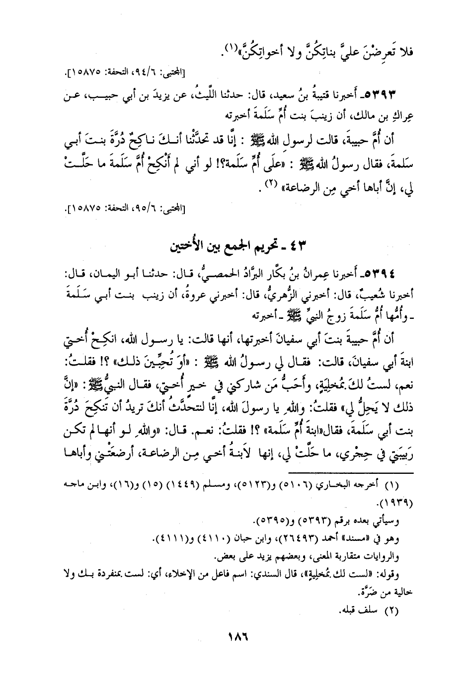5393 - أَخْبَرَنَا قُتَيْبَةُ بْنُ سَعِيدٍ، قَالَ: حَدَّثَنَا اللَّيْثُ، عَنْ يَزِيدَ بْنِ أَبِي حَبِيبٍ، عَنْ عِرَاكِ بْنِ مَالِكٍ، أَنَّ زَيْنَبَ بِنْتَ أُمِّ سَلَمَةَ، أَخْبَرَتْهُ أَنَّ أُمَّ حَبِيبَةَ، قَالَتْ لِرَسُولِ اللهِ صَلَّى اللهُ عَلَيْهِ وَسَلَّمَ: إِنَّا قَدْ تَحَدَّثْنَا أَنَّكَ نَاكِحٌ دُرَّةَ بِنْتَ أَبِي سَلَمَةَ، فَقَالَ رَسُولُ اللهِ صَلَّى اللهُ عَلَيْهِ وَسَلَّمَ: «§أَعَلَى أُمِّ سَلَمَةَ لَوْ أَنِّي لَمْ أَنْكِحْ أُمَّ سَلَمَةَ مَا حَلَّتْ لِي، إِنَّ أَبَاهَا أَخِي مِنَ الرَّضَاعَةِ»