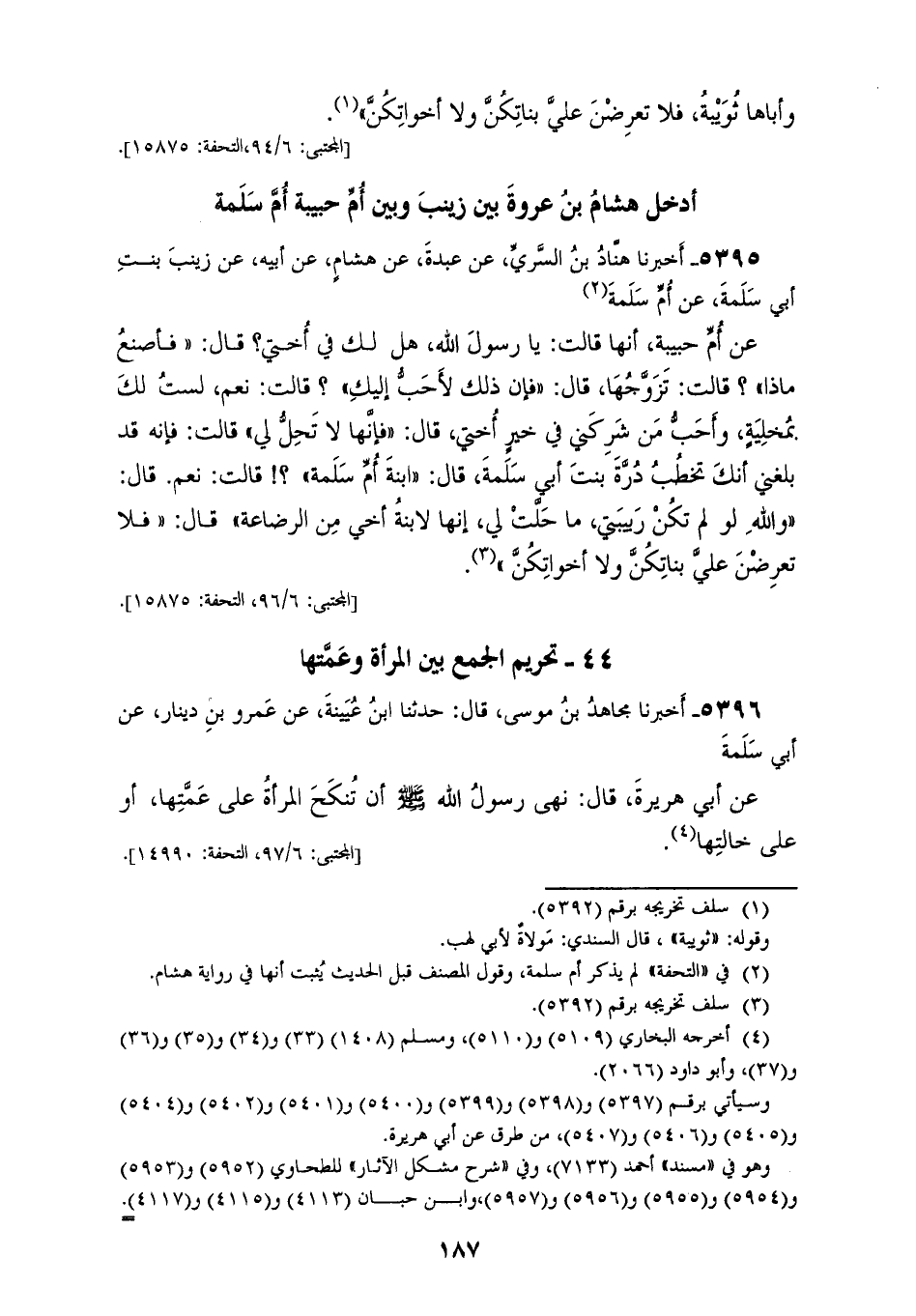 5396 - أَخْبَرَنَا مُجَاهِدُ بْنُ مُوسَى، قَالَ: حَدَّثَنَا ابْنُ عُيَيْنَةَ، عَنْ عَمْرِو بْنِ دِينَارٍ، عَنْ أَبِي سَلَمَةَ، عَنْ أَبِي هُرَيْرَةَ، قَالَ: «§نَهَى رَسُولُ اللهِ صَلَّى اللهُ عَلَيْهِ وَسَلَّمَ أَنْ تُنْكَحَ الْمَرْأَةُ عَلَى عَمَّتِهَا أَوْ عَلَى خَالَتِهَا»