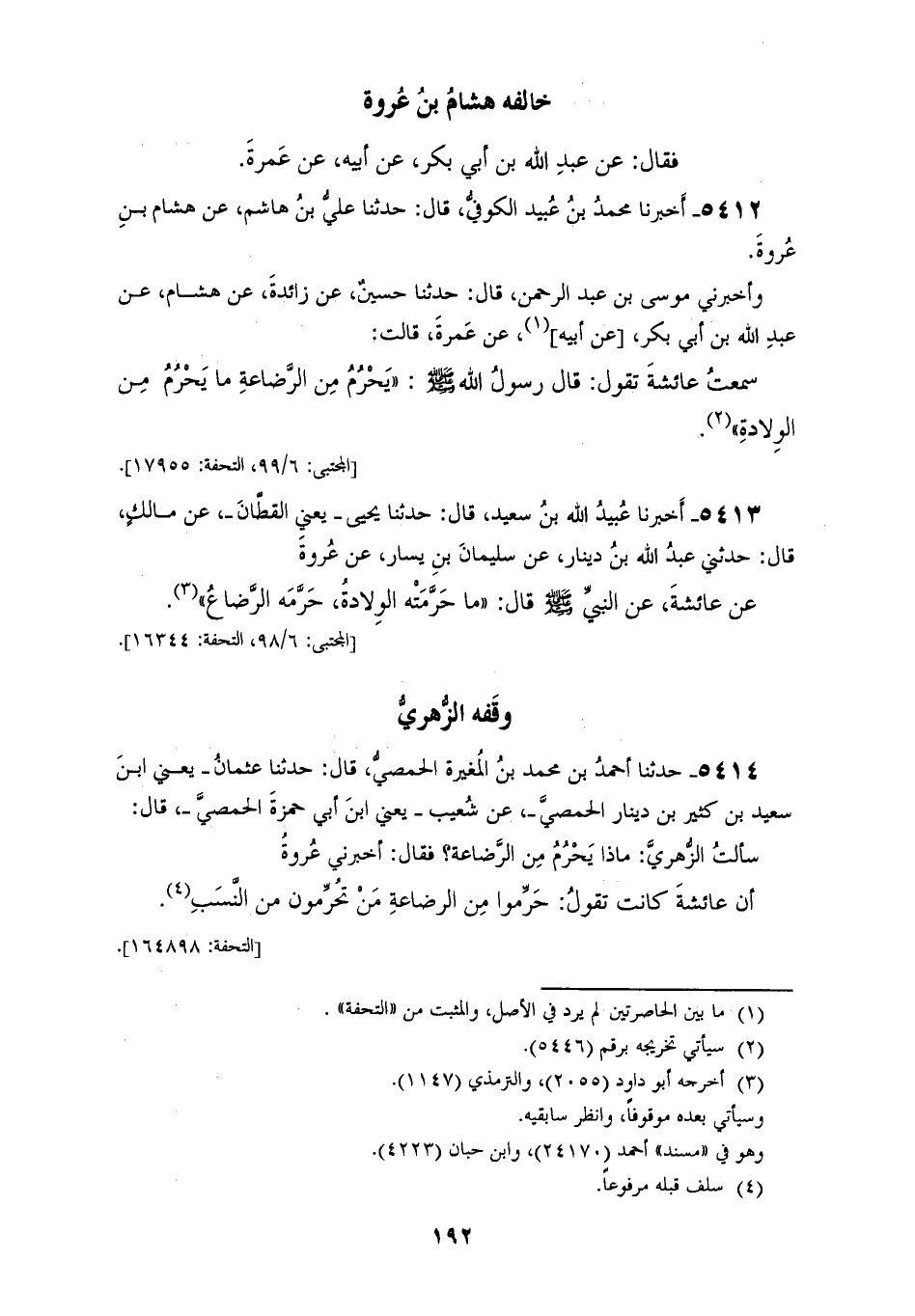 5412 - أَخْبَرَنَا مُحَمَّدُ بْنُ عُبَيْدٍ الْكُوفِيُّ، قَالَ: حَدَّثَنَا عَلِيُّ بْنُ هَاشِمٍ، عَنْ هِشَامِ بْنِ عُرْوَةَ، وَأَخْبَرَنِي مُوسَى بْنُ عَبْدِ الرَّحْمَنِ، قَالَ: ثنا حُسَيْنٌ، عَنْ زَائِدَةَ، عَنْ هِشَامٍ، عَنْ عَبْدِ اللهِ بْنِ أَبِي بَكْرٍ، عَنْ أَبِيهِ، عَنْ عَمْرَةَ، قَالَتْ: سَمِعْتُ عَائِشَةَ، تَقُولُ: قَالَ رَسُولُ اللهِ صَلَّى اللهُ عَلَيْهِ وَسَلَّمَ: «§يَحْرُمُ مِنَ الرَّضَاعَةِ مَا يَحْرُمُ مِنَ الْوِلَادَةِ»