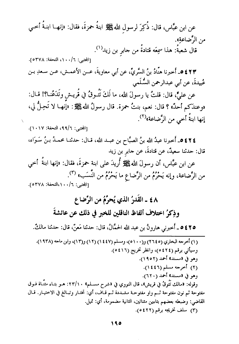 5422 - أَخْبَرَنِي إِبْرَاهِيمُ بْنُ مُحَمَّدِ بْنِ التَّيْمِيِّ الْقَاضِي، قَالَ: حَدَّثَنَا يَحْيَى وَهُوَ الْقَطَّانُ، عَنْ شُعْبَةَ، عَنْ قَتَادَةَ، عَنْ جَابِرِ بْنِ زَيْدٍ، عَنِ ابْنِ عَبَّاسٍ، قَالَ: ذُكِرَ لِرَسُولِ اللهِ صَلَّى اللهُ عَلَيْهِ وَسَلَّمَ ابْنَةَ حَمْزَةَ، فَقَالَ: «§إِنَّهَا ابْنَةُ أَخِي مِنَ الرَّضَاعَةِ»، قَالَ شُعْبَةُ: هَذَا سَمِعَهُ قَتَادَةُ مِنْ جَابِرِ بْنِ زَيْدٍ