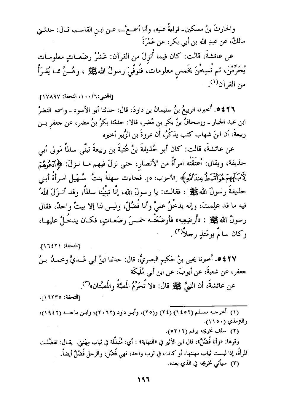 5425 - أَخْبَرَنِي هَارُونُ بْنُ عَبْدِ اللهِ الْحَمَّالُ، قَالَ: حَدَّثَنَا مَعْنٌ، قَالَ: حَدَّثَنَا مَالِكٌ، وَالْحَارِثُ بْنُ مِسْكِينٍ، قِرَاءَةً عَلَيْهِ وَأَنَا أَسْمَعُ، عَنِ ابْنِ الْقَاسِمِ، قَالَ: حَدَّثَنِي مَالِكٌ، عَنْ عَبْدِ اللهِ بْنِ أَبِي بَكْرٍ، عَنْ عَمْرَةَ، عَنْ عَائِشَةَ، قَالَتْ: «§كَانَ فِيمَا أُنْزِلَ مِنَ الْقُرْآنِ عَشْرُ رَضَعَاتٍ مَعْلُومَاتٍ يُحَرِّمْنَ، ثُمَّ نُسِخْنَ بِخَمْسٍ مَعْلُومَاتٍ، فَتُوُفِّيَ رَسُولُ اللهِ صَلَّى اللهُ عَلَيْهِ وَسَلَّمَ، وَهُنَّ مِمَّا يُقْرَأُ مِنَ الْقُرْآنِ»