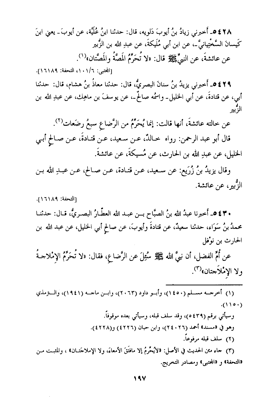 5428 - أَخْبَرَنِي زِيَادُ بْنُ أَيُّوبَ دَلُّوَيْهِ قَالَ: حَدَّثَنَا ابْنُ عُلَيَّةَ، عَنْ أَيُّوبَ يَعْنِي ابْنَ كَيْسَانَ السَّخْتِيَانِيَّ، عَنِ ابْنِ أَبِي مُلَيْكَةَ، عَنْ عَبْدِ اللهِ بْنِ الزُّبَيْرِ، عَنْ عَائِشَةَ، عَنِ النَّبِيِّ صَلَّى اللهُ عَلَيْهِ وَسَلَّمَ قَالَ: «§لَا تُحَرِّمُ الْمَصَّةُ، وَالْمَصَّتَانِ»
