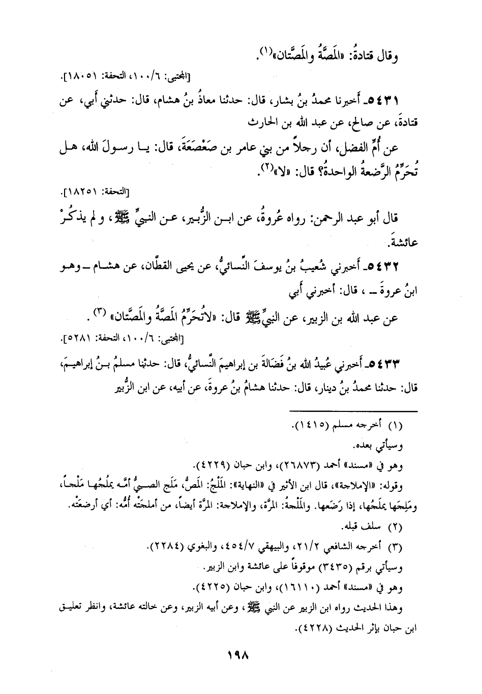 5432 - أَخْبَرَنِي شُعَيْبُ بْنُ يُوسُفَ النَّسَائِيُّ، عَنْ يَحْيَى الْقَطَّانِ، عَنْ هِشَامٍ وَهُوَ ابْنُ عُرْوَةَ، قَالَ: أَخْبَرَنِي أَبِي، عَنْ عَبْدِ اللهِ بْنِ الزُّبَيْرِ، عَنِ النَّبِيِّ صَلَّى اللهُ عَلَيْهِ وَسَلَّمَ قَالَ: «§لَا تُحَرِّمُ الْمَصَّةُ، وَالْمَصَّتَانِ»
