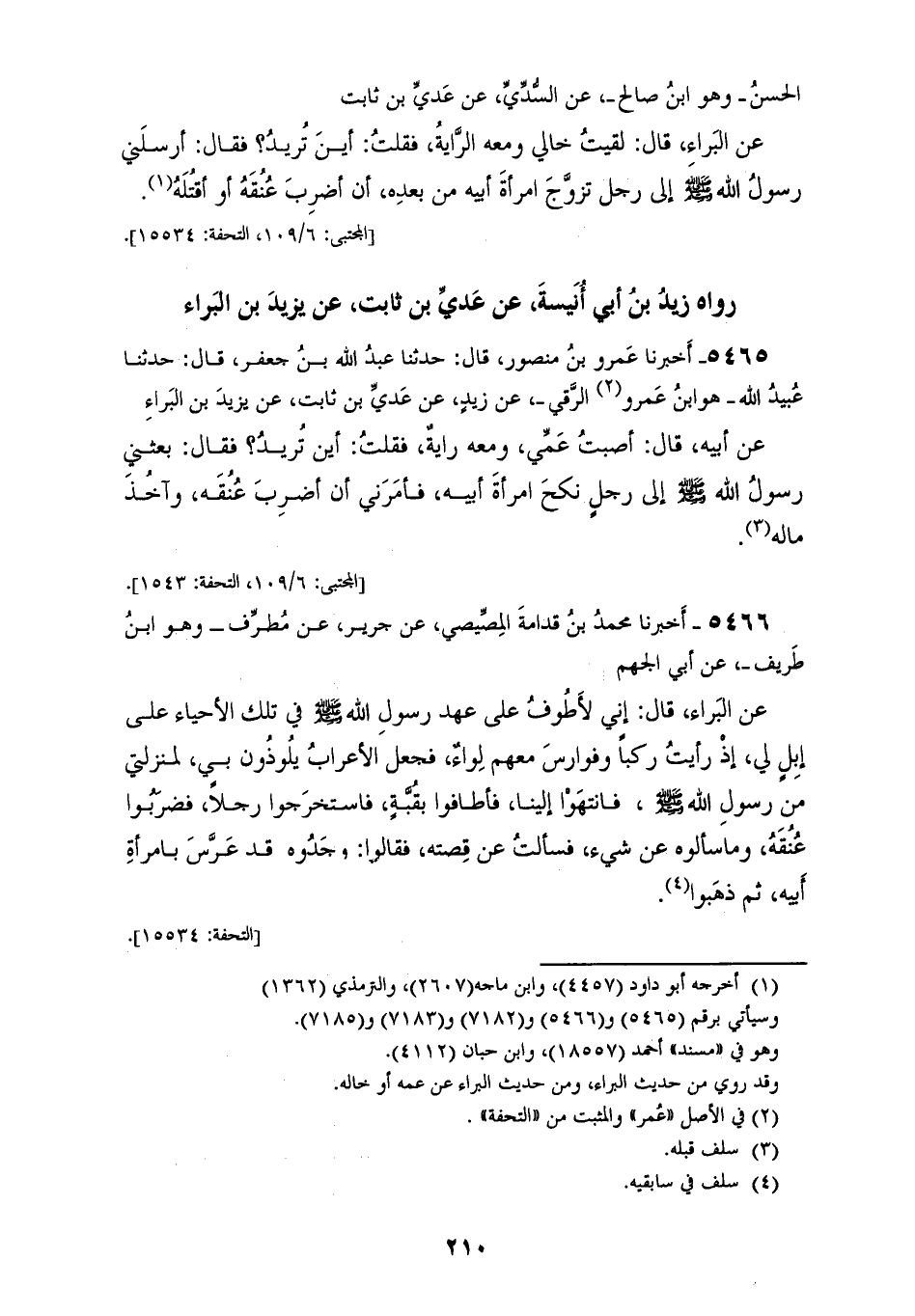 5466 - أَخْبَرَنَا مُحَمَّدُ بْنُ قُدَامَةَ الْمِصِّيصِيُّ، عَنْ جَرِيرٍ، عَنْ مُطَرِّفٍ وَهُوَ ابْنُ طَرِيفٍ، عَنْ أَبِي الْجَهْمِ، عَنِ الْبَرَاءِ، قَالَ: إِنِّي §لَأَطُوفُ عَلَى عَهْدِ رَسُولِ اللهِ صَلَّى اللهُ عَلَيْهِ وَسَلَّمَ فِي تِلْكَ الْأَحْيَاءِ عَلَى إِبِلٍ لِي، إِذْ رَأَيْتُ رَكْبًا، وَفَوَارِسَ مَعَهُمْ لِوَاءٌ، فَجَعَلَ الْأَعْرَابُ يَلُوذُونَ بِي لِمَنْزِلَتِي مِنْ رَسُولِ اللهِ صَلَّى اللهُ عَلَيْهِ وَسَلَّمَ، فَانْتَهَوْا إِلَيْنَا، فَأَطَافُوا بِقُبَّةٍ فَاسْتَخْرَجُوا فَضَرَبُوا عُنُقَهُ وَمَا سَأَلُوهُ عَنْ شَيْءٍ، فَسَأَلْتُ عَنْ قِصَّتِهِ، فَقَالُوا: وَجَدُوهُ قَدْ عَرَّسَ بِامْرَأَةِ أَبِيهِ ثُمَّ ذَهَبُوا