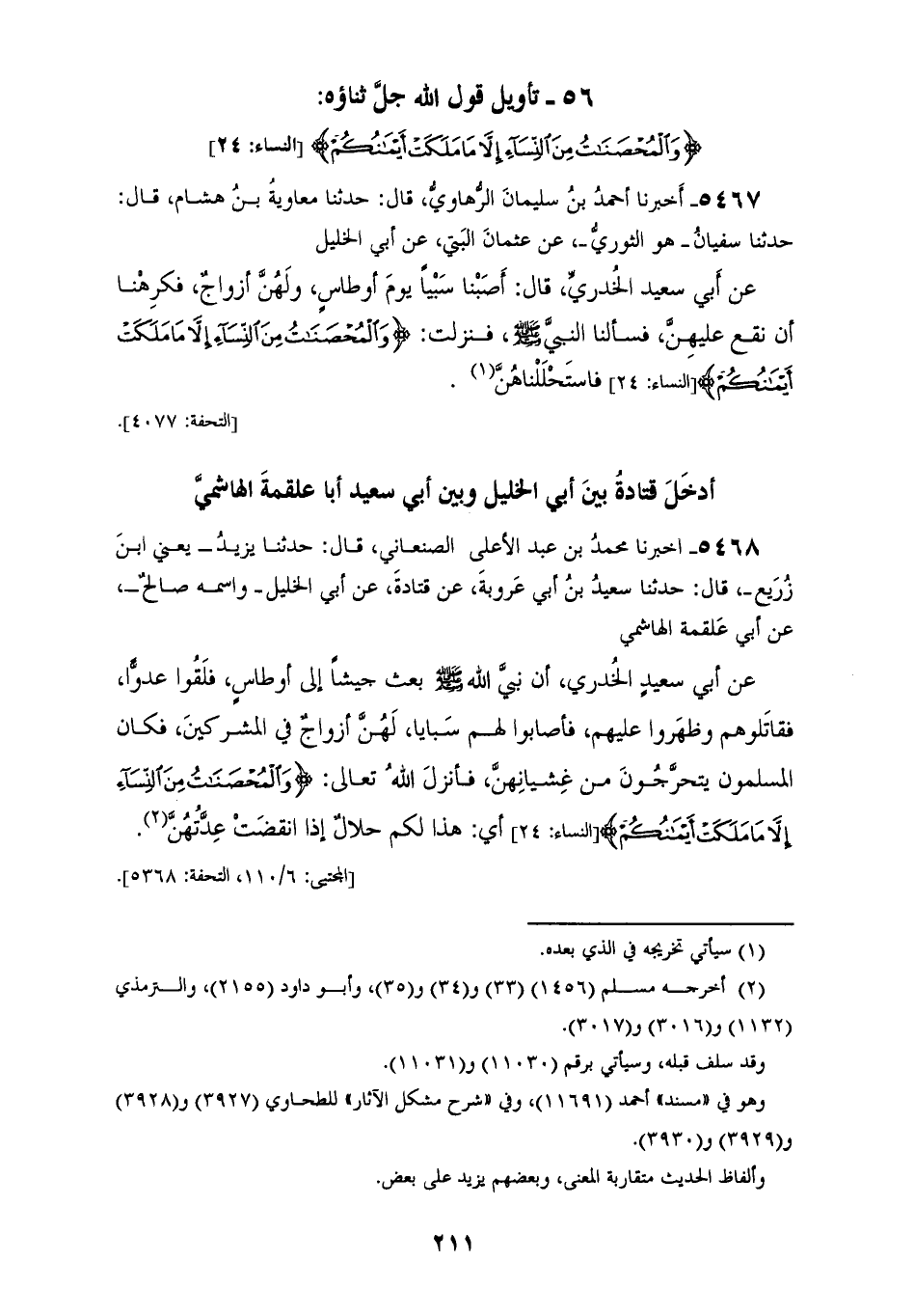 5467 - أَخْبَرَنَا أَحْمَدُ بْنُ سُلَيْمَانَ الرُّهَاوِيُّ، قَالَ: حَدَّثَنَا مُعَاوِيَةُ بْنُ هِشَامٍ، قَالَ: حَدَّثَنَا سُفْيَانُ هُوَ الثَّوْرِيُّ، عَنْ عُثْمَانَ التَّيْمِيِّ، عَنْ أَبِي الْخَلِيلِ، عَنْ أَبِي سَعِيدٍ الْخُدْرِيِّ، قَالَ: أَصَبْنَا سَبْيًا يَوْمَ أَوْطَاسٍ، وَلَهُنَّ أَزْوَاجٌ فَكَرِهْنَا أَنْ نَقَعَ عَلَيْهِنَّ فَسَأَلْنَا النَّبِيَّ صَلَّى اللهُ عَلَيْهِ وَسَلَّمَ فَنَزَلَتْ: {§وَالْمُحْصَنَاتُ مِنَ النِّسَاءِ، إِلَّا مَا مَلَكَتْ أَيْمَانُكُمْ} [النساء: 24] فَاسْتَحْلَلْنَاهُنَّ " أَدْخَلَ قَتَادَةُ بَيْنَ أَبِي الْخَلِيلِ، وَبَيْنَ أَبِي سَعِيدٍ أَبَا عَلْقَمَةَ الْهَاشِمِيَّ