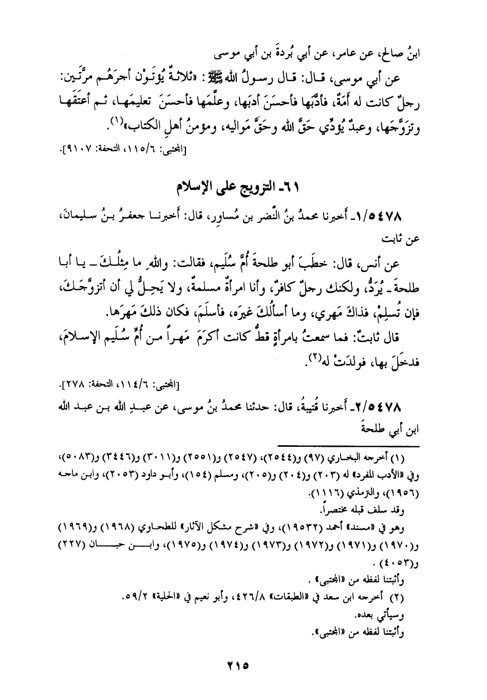 5478 - أَخْبَرَنَا مُحَمَّدُ بْنُ النَّضْرِ بْنِ مُسَاوِرٍ، قَالَ: أَخْبَرَنَا جَعْفَرُ بْنُ سُلَيْمَانَ، عَنْ ثَابِتٍ، عَنْ أَنَسٍ، قَالَ: " §خَطَبَ أَبُو طَلْحَةَ أُمَّ سُلَيْمٍ، فَقَالَتْ: وَاللهِ مَا مِثْلُكَ يَا أَبَا طَلْحَةَ يُرَدُّ، وَلَكِنَّكَ رَجُلٌ كَافِرٌ، وَأَنَا امْرَأَةٌ مَسْلَمَةٌ، وَلَا يَحِلُّ لِي أَنْ أَتَزَوَّجَكَ، فَإِنْ تَسْلَمْ فَذَاكَ مَهْرِي، وَمَا أَسْأَلُكَ غَيْرَهُ، فَأَسْلَمَ فَكَانَ ذَلِكَ مَهْرَهَا " قَالَ ثَابِتٌ: فَمَا سَمِعْتُ بِامْرَأَةٍ قَطُّ كَانَتْ أَكْرَمَ مَهْرًا مِنْ أُمِّ سُلَيْمٍ الْإِسْلَامَ فَدَخَلَ بِهَا فَوَلَدَتْ لَهُ