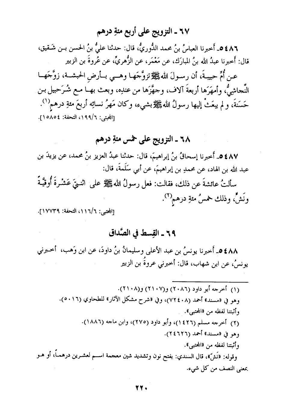 5487 - أَخْبَرَنَا إِسْحَاقُ بْنُ إِبْرَاهِيمَ، قَالَ: حَدَّثَنَا عَبْدُ الْعَزِيزِ بْنُ مُحَمَّدٍ، عَنْ يَزِيدَ بْنِ عَبْدِ اللهِ بْنِ الْهَادِ، عَنْ مُحَمَّدِ بْنِ إِبْرَاهِيمَ، عَنْ أَبِي سَلَمَةَ، قَالَ: سَأَلْتُ عَائِشَةَ عَنْ ذَلِكَ، فَقَالَتْ: «§فَعَلَ رَسُولُ اللهِ صَلَّى اللهُ عَلَيْهِ وَسَلَّمَ عَلَى اثْنَتَيْ عَشْرَةَ أُوقِيَّةً، وَنَشٍّ وَذَلِكَ خَمْسُمِائَةٍ دِرْهَمٍ»
