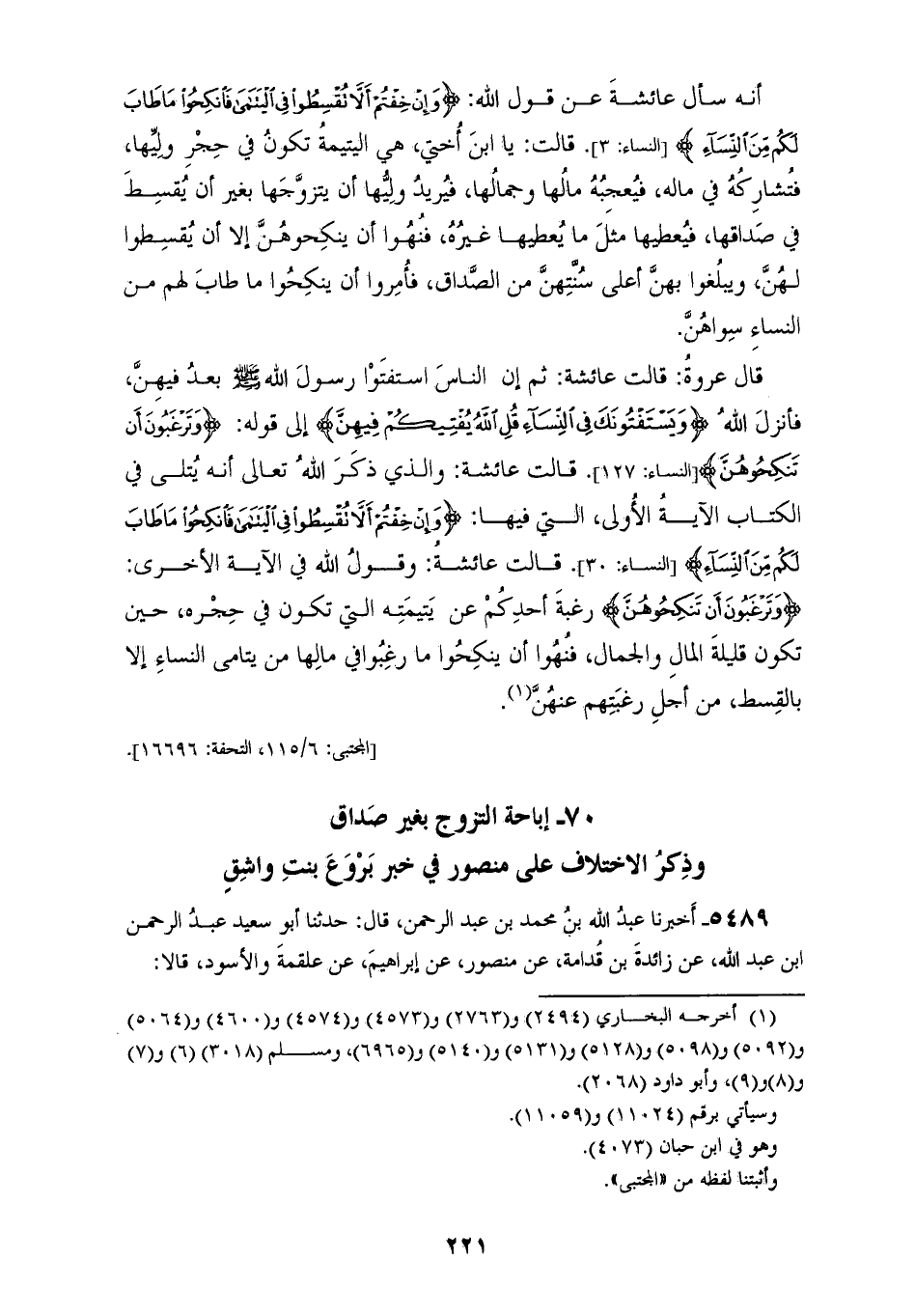 5488 - أَخْبَرَنَا يُونُسُ بْنُ عَبْدِ الْأَعْلَى، وَسُلَيْمَانُ بْنُ دَاوُدَ، عَنِ ابْنِ وَهْبٍ، أَخْبَرَنِي يُونُسُ، عَنِ ابْنِ شِهَابٍ، قَالَ: أَخْبَرَنِي عُرْوَةُ بْنُ الزُّبَيْرِ، أَنَّهُ سَأَلَ عَائِشَةَ عَنْ قَوْلِ اللهِ عَزَّ وَجَلَّ: {§وَإِنْ خِفْتُمْ أَلَّا تُقْسِطُوا فِي الْيَتَامَى، فَانْكِحُوا مَا طَابَ لَكُمْ مِنَ النِّسَاءِ} [النساء: 3]، قَالَتْ: يَا ابْنَ أُخْتِي هِيَ الْيَتِيمَةُ تَكُونُ فِي حِجْرِ وَلِيِّهَا، فَتُشَارِكُهُ فِي مَالِهِ فَيُعْجِبُهُ مَالُهَا، وَجَمَالُهَا فَيُرِيدُ وَلِيُّهَا أَنْ يَتَزَوَّجَهَا بِغَيْرِ أَنْ يُقْسِطَ فِي صَدَاقِهَا، فَيُعْطِيَهَا مِثْلَ مَا يُعْطِيهَا غَيْرُهُ، فَنُهُوا أَنْ يُنْكِحُوهُنَّ إِلَّا أَنْ يُقْسِطُوا لَهُنَّ، وَيَبْلُغُوا بِهِنَّ أَعَلَى سُنَّتِهِنَّ مِنَ الصَّدَاقِ، فَأُمِرُوا أَنْ يَنْكِحُوا مَا طَابَ لَهُمْ مِنَ النِّسَاءِ سِوَاهُنَّ، قَالَ عُرْوَةُ: قَالَتْ عَائِشَةُ: ثُمَّ إِنَّ النَّاسَ اسْتَفْتَوْا رَسُولَ اللهِ صَلَّى اللهُ عَلَيْهِ وَسَلَّمَ بَعْدُ فِيهِنَّ فَأَنْزَلَ اللهُ: {وَيَسْتَفْتُونَكَ فِي النِّسَاءِ قُلِ اللهُ يُفْتِيكُمْ فِيهِنَّ} [النساء: 127] إِلَى قَوْلِهِ: {وَتَرْغَبُونَ أَنْ تَنْكِحُوهُنَّ} [النساء: 127] قَالَتْ عَائِشَةُ: وَالَّذِي ذَكَرَ اللهُ تَعَالَى أَنَّهُ يُتْلَى فِي الْكِتَابِ الْآيَةُ الْأُولَى الَّتِي فِيهَا {وَإِنْ خِفْتُمْ أَنْ لَا تُقْسِطُوا فِي الْيَتَامَى، فَانْكِحُوا مَا طَابَ لَكُمْ مِنَ النِّسَاءِ}، قَالَتْ عَائِشَةُ: وَقَوْلُ اللهِ فِي الْآيَةِ الْأُخْرَى: {وَتَرْغَبُونَ أَنْ تَنْكِحُوهُنَّ} [النساء: 127] رَغْبَةَ أَحَدِكُمْ عَنْ يَتِيمَتِهِ الَّتِي تَكُونُ فِي حِجْرِهِ حِينَ تَكُونُ قَلِيلَةَ الْمَالِ، وَالْجَمَالِ فَنُهُوا أَنْ يَنْكِحُوا مَا رَغِبُوا فِي مَالِهَا مِنْ يَتَامَى النِّسَاءِ، إِلَّا بِالْقِسْطِ مِنْ أَجْلِ رَغْبَتِهِمْ عَنْهُنَّ "