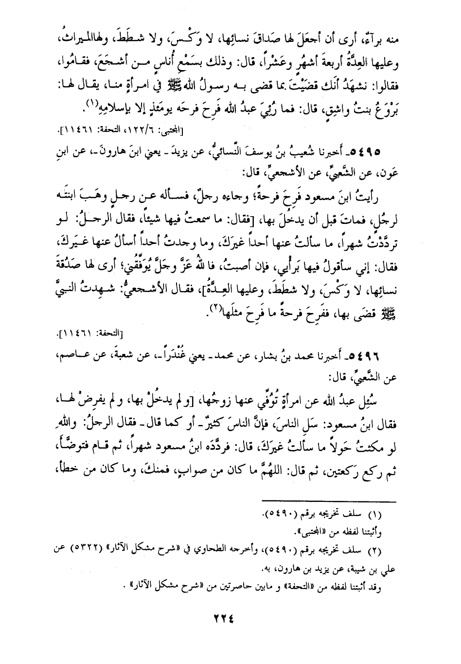 5496 - أَخْبَرَنَا مُحَمَّدُ بْنُ بَشَّارٍ، عَنْ مُحَمَّدٍ يَعْنِي غُنْدَرًا، عَنْ شُعْبَةَ، عَنْ عَاصِمٍ، عَنِ الشَّعْبِيِّ، قَالَ: سُئِلَ عَبْدُ اللهِ عَنِ امْرَأَةٍ، تُوُفِّيَ عَنْهَا زَوْجُهَا، وَلَمْ يَدْخُلْ بِهَا، وَلَمْ يَفْرِضْ لَهَا، فَقَالَ ابْنُ مَسْعُودٍ: سَلِ النَّاسَ، فَإِنَّ النَّاسَ كَثِيرٌ، أَوْ كَمَا قَالَ: فَقَالَ الرَّجُلُ: وَاللهِ لَوْ مَكَثْتُ حَوْلًا مَا سَأَلْتُ غَيْرَكَ قَالَ: فَرَّدَدَهُ ابْنُ مَسْعُودٍ شَهْرًا، ثُمَّ قَامَ فَتَوَضَّأَ ثُمَّ رَكَعَ رَكْعَتَيْنِ، ثُمَّ قَالَ: اللهُمَّ مَا كَانَ مِنْ صَوَابٍ فَمِنْكَ، وَمَا كَانَ مِنْ خَطَأٍ، فَمِنِّي ثُمَّ قَالَ: أَرَى §لَهَا صَدَاقَ إِحْدَى نِسَائِهَا، وَلَهَا الْمِيرَاثُ مَعَ ذَلِكَ وَعَلَيْهَا الْعِدَّةُ، فَقَامَ رَجُلٌ مِنْ أَشْجَعَ، فَقَالَ: " قَضَى فِينَا رَسُولُ اللهِ صَلَّى اللهُ عَلَيْهِ وَسَلَّمَ بِمِثْلِ ذَلِكَ فِي امْرَأَةٍ مِنَّا يُقَالُ لَهَا بَرْوَعُ بِنْتُ وَاشِقٍ، فَقَالَ ابْنُ مَسْعُودٍ: هَلْ مَعَكَ أَحَدٌ؟ فَقَامَ أُنَاسٌ مِنْهُمْ فَشَهِدُوا