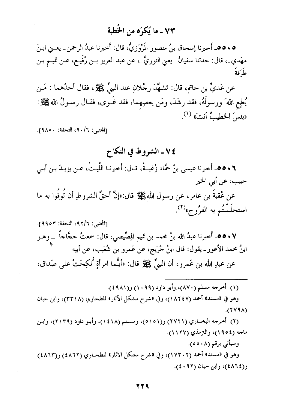 5506 - أَخْبَرَنَا عِيسَى بْنُ حَمَّادِ بْنِ زُغْبَةَ، قَالَ: أَخْبَرَنَا اللَّيْثُ، عَنْ يَزِيدَ بْنِ أَبِي حَبِيبٍ، عَنْ أَبِي الْخَيْرِ، عَنْ عُقْبَةَ بْنِ عَامِرٍ، عَنْ رَسُولِ اللهِ صَلَّى اللهُ عَلَيْهِ وَسَلَّمَ قَالَ: «إِنَّ §أَحَقَّ الشُّرُوطِ أَنْ تُوفُوا بِهِ مَا اسْتَحْلَلْتُمْ بِهِ الْفُرُوجَ»