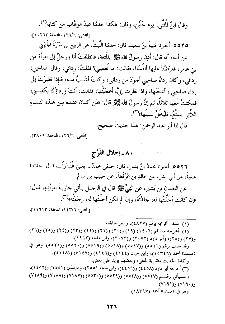 5525 - أَخْبَرَنَا قُتَيْبَةُ بْنُ سَعِيدٍ، قَالَ: حَدَّثَنَا اللَّيْثُ، عَنِ الرَّبِيعِ بْنِ سَبْرَةَ الْجُهَنِيِّ، عَنْ أَبِيهِ، أَنَّهُ قَالَ: أَذِنَ رَسُولُ اللهِ صَلَّى اللهُ عَلَيْهِ وَسَلَّمَ بِالْمُتْعَةِ، فَانْطَلَقْتُ أَنَا وَرَجُلٌ إِلَى امْرَأَةٍ مِنْ بَنِي عَامِرٍ، فَعَرَضْنَا عَلَيْهَا أَنْفُسَنَا فَقَالَتْ: مَا تُعْطِينِي؟ فَقُلْتُ: رِدَائِي وَقَالَ صَاحِبِي: رِدَائِي، وَكَانَ رِدَاءُ صَاحِبِي أَجْوَدَ مِنْ رِدَائِي، وَكُنْتُ أَشَبَّ مِنْهُ، فَإِذَا نَظَرَتْ إِلَى رِدَاءِ صَاحِبِي أَعْجَبَهَا، وَإِذَا نَظَرَتْ إِلَيَّ أَعْجَبْتُهَا فَقَالَتْ: أَنْتَ وَرِدَاؤُكَ يَكْفِينِي فَمَكَثْتُ مَعَهَا ثَلَاثًا، ثُمَّ إِنَّ رَسُولَ اللهِ صَلَّى اللهُ عَلَيْهِ وَسَلَّمَ قَالَ: «§مَنْ كَانَ عِنْدَهُ مِنْ هَذِهِ النِّسَاءِ اللَّاتِي يَتَمَتَّعُ فَلْيُخَلِّ سَبِيلَهَا» قَالَ لَنَا أَبُو عَبْدِ الرَّحْمَنِ: هَذَا حَدِيثٌ صَحِيحٌ