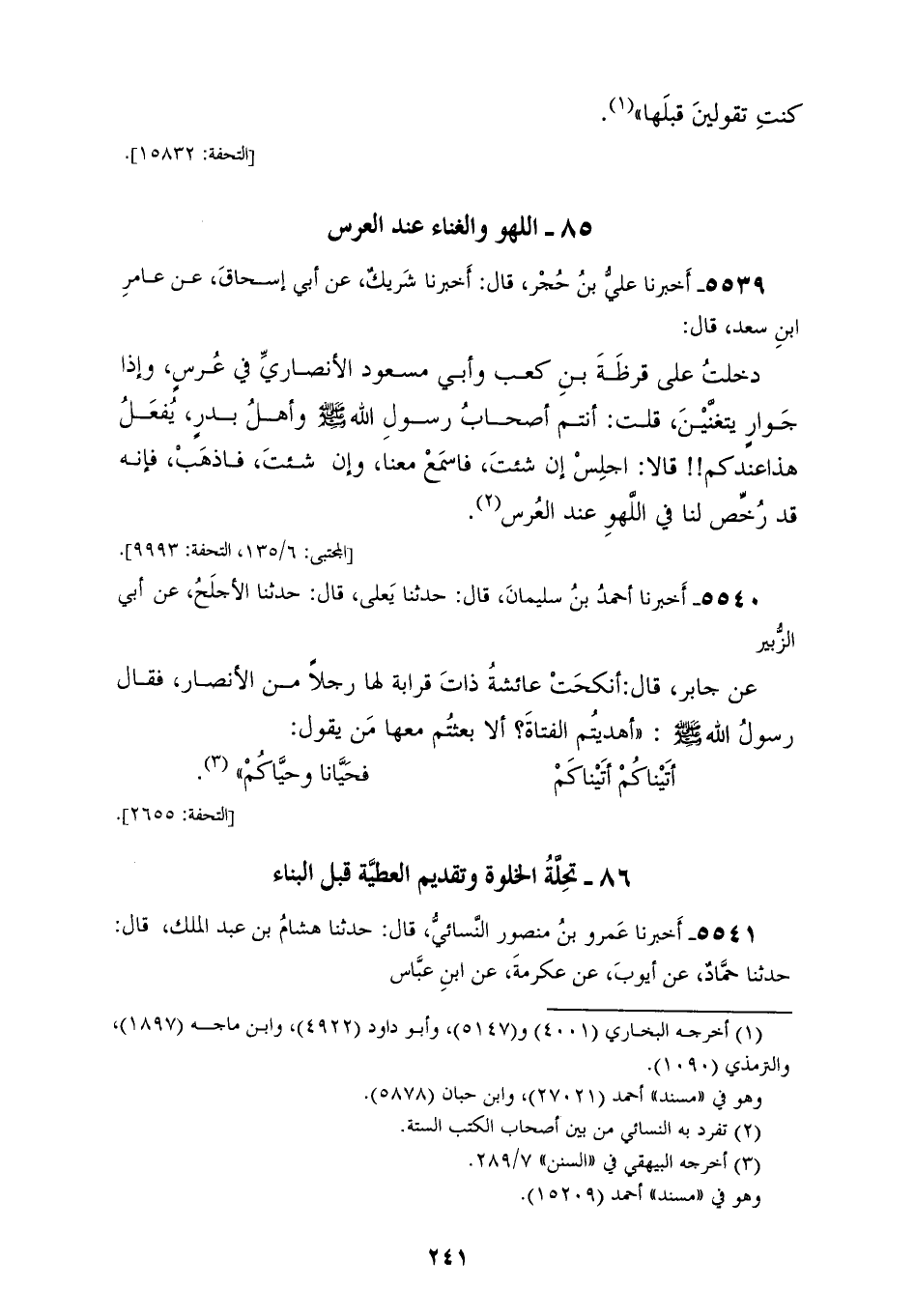 5539 - أَخْبَرَنَا عَلِيُّ بْنُ حُجْرٍ، قَالَ: أَخْبَرَنَا شَرِيكٌ، عَنْ أَبِي إِسْحَاقَ، عَنْ عَامِرِ بْنِ سَعْدٍ، قَالَ: دَخَلْتُ عَلَى قَرَظَةَ بْنِ كَعْبٍ، وَأَبِي مَسْعُودٍ الْأَنْصَارِيِّ فِي عُرْسٍ، وَإِذَا جَوَارٍ يَتغَنَّيْنَ قُلْتُ: أَنْتُمَ أَصَحَابُ رَسُولِ اللهِ صَلَّى اللهُ عَلَيْهِ وَسَلَّمَ، وَأَهْلُ بَدْرٍ يَفْعَلُ هَذَا عِنْدَكُمْ قَالَا: اجْلِسْ إِنْ شِئْتَ فَاسْمَعْ مَعَنَا، وَإِنْ شِئْتَ فَاذْهَبْ فَإِنَّهُ قَدْ «§رُخِّصَ لَنَا فِي اللهْوِ عِنْدَ الْعُرْسِ»